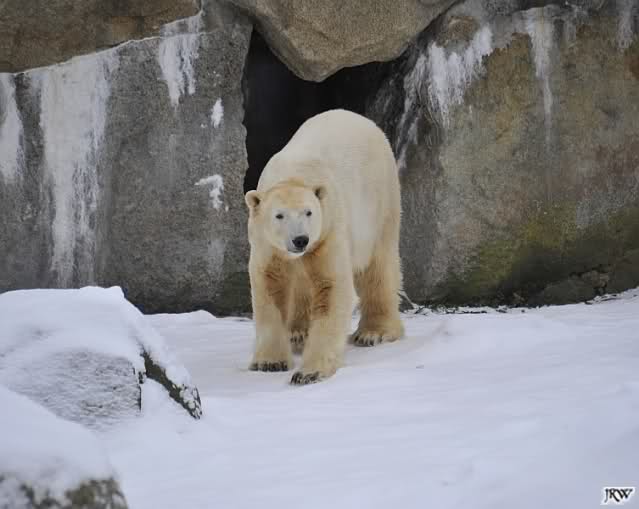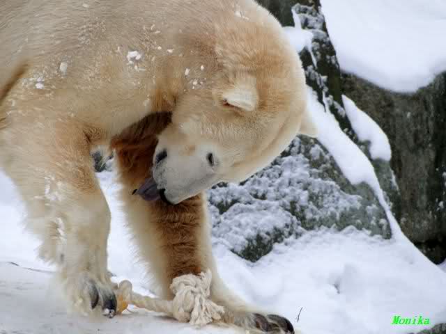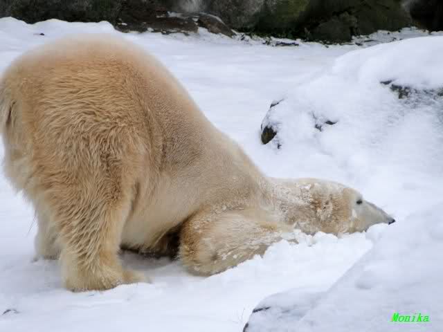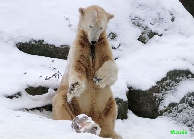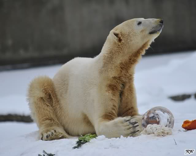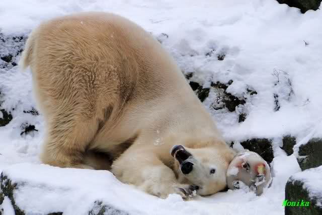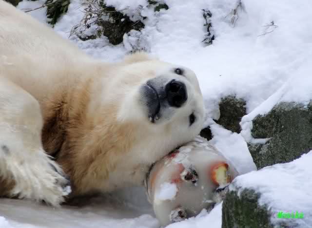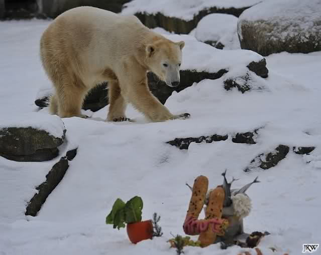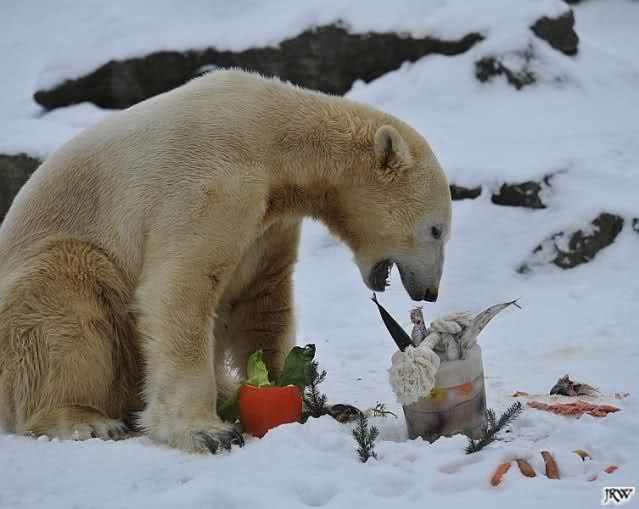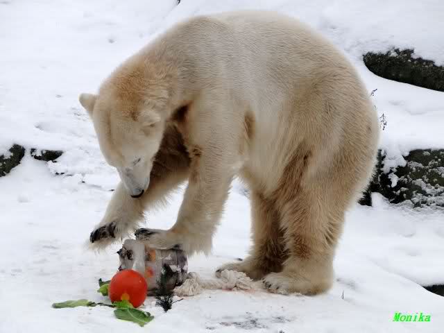 Für Knut war der Geburtstag nett. Er schien sich rundum wohl zu fühlen. Nachdem die Überraschungen von den Pflegern aufgestellt waren, kam Knut langsam heraus auf die Anlage und schaute sich erst einmal um. Nachdem er feststellte, dass er allein war, ging er zielstrebig auf seine Geschenke zu. Man konnte ihm ansehen, wie viel Freude er hatte. Die leckere VIER hatte er bald verspeist und machte sich nach und nach an die anderen Leckereien. Nachdem er an der Eisbombe genibbelt, gekratzt und genascht hatte, stellte er fest, dass man sie auch gut rollen konnte. Es war brechend voll. Sobald man sich auch nur einen Schritt von seinem Platz bewegte, war er weg.