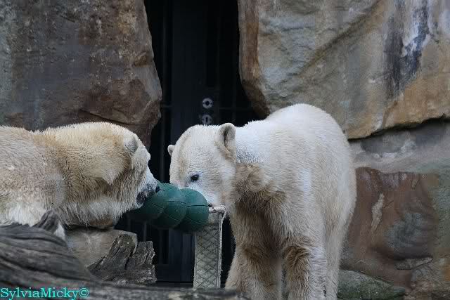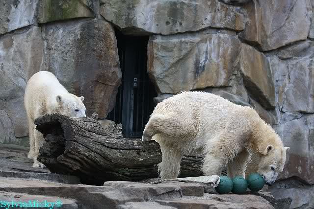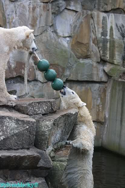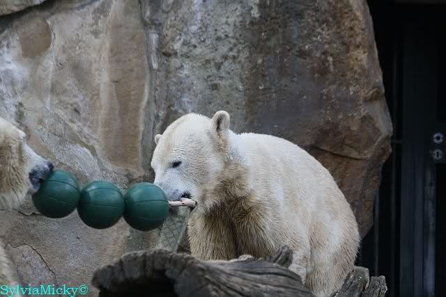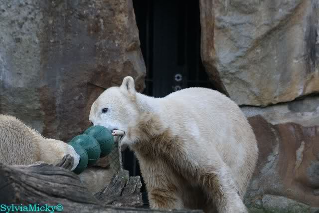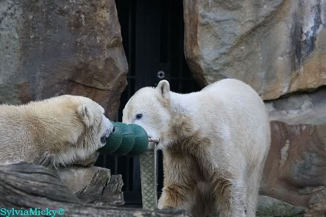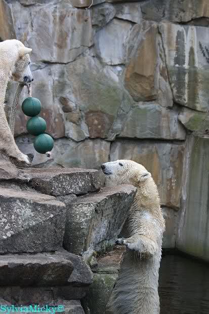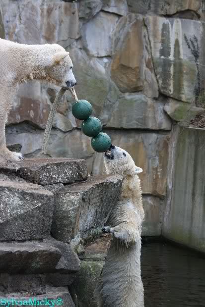 Sie spielte mit den Kugeln und brachte sie zu Knut. Diesmal tat er ihr den Gefallen, er beteiligte sich am Tauziehen. Die Sonne verschönte die beiden Bären noch mehr durch die Licht- und Schattenspiele.