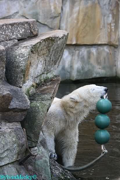 Nach der Fütterung drehte Gianna voll auf. Sie holte sich die Kugeln aus dem Wasser legte sie auf den Felsen, schob sie ins Wasser, holte sie wieder raus und spielte Kugelziehen mit Knut. Der diesmal wieder als Sieger hervor ging.