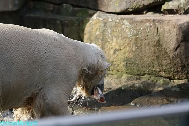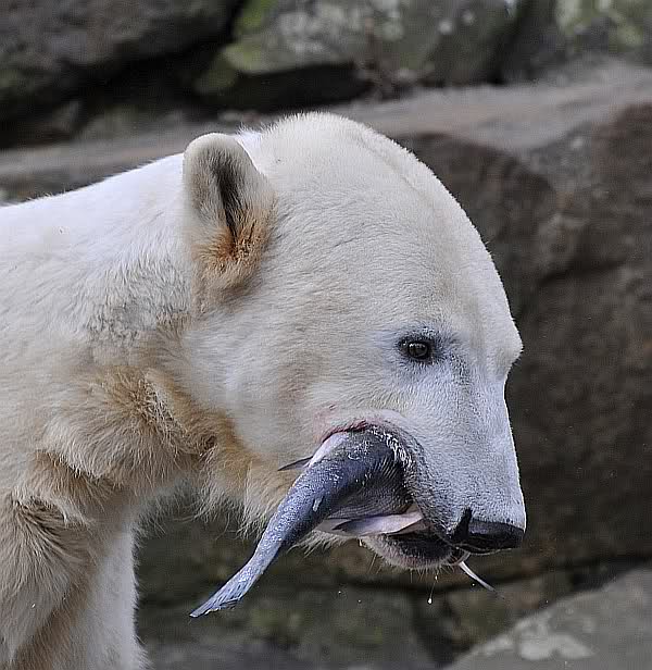Zur Fütterung bekam Knut u.a. einen schönen großen Lachs von dem Knutfreund von gestern.