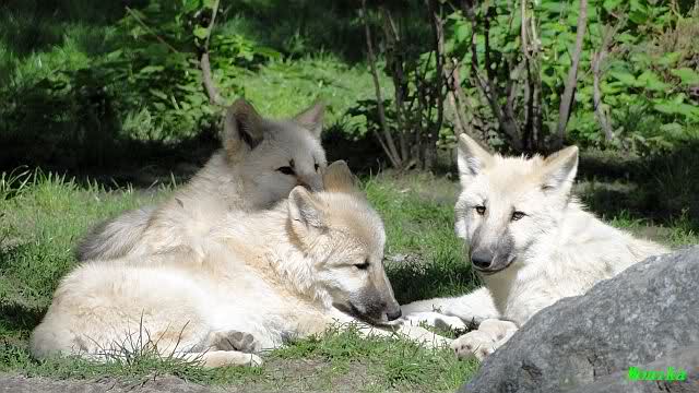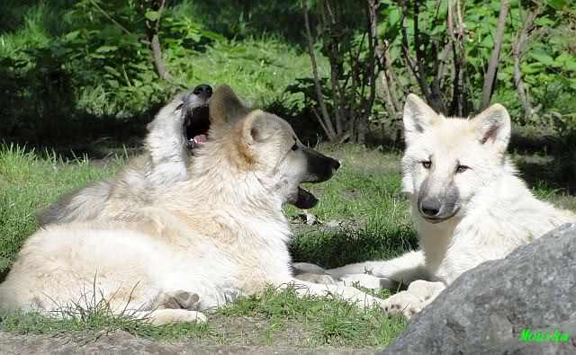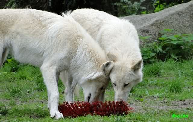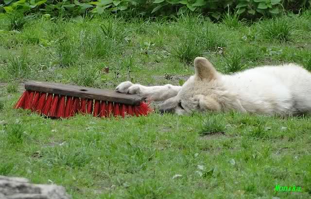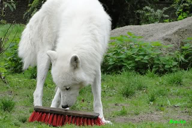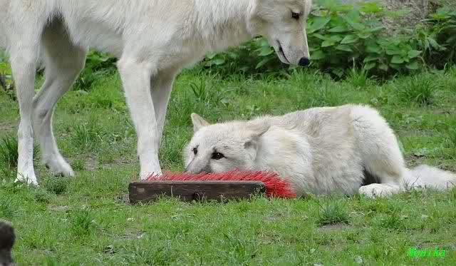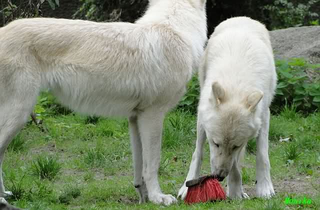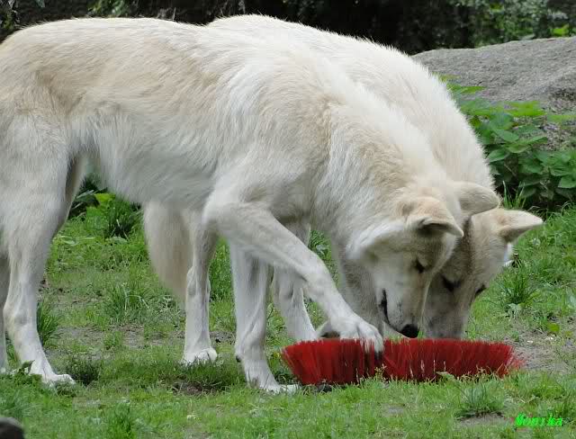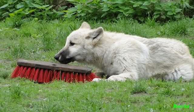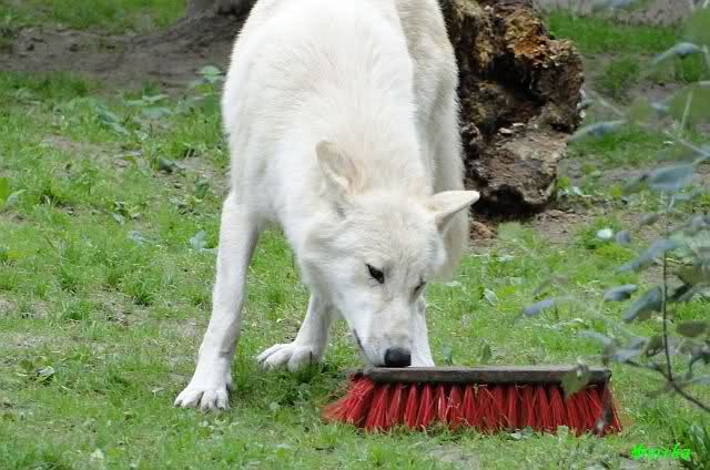Die Wölfe haben heute "Naturspielzeug" bekommen. Frau Weckert warf einen Besen ins Gehege.