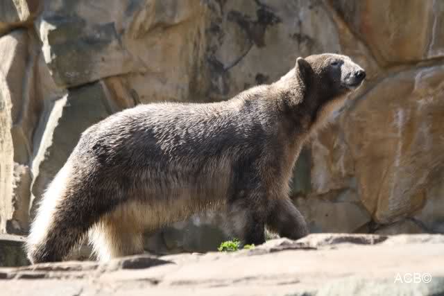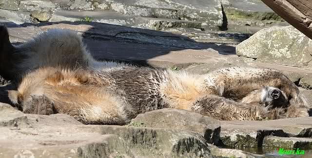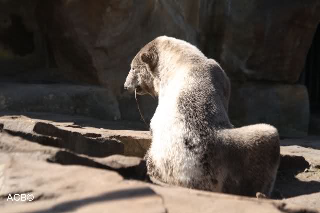 Knut hat sich anschließend ausgiebig im Sand gewälzt und sich wieder in einen Schwarzbär verwandelt. Gianna kletterte derweil den Felsen entlang und plumpste ins Wasser. Wo sie schon mal drin war, spielte sie mit den Kugeln und das Brett. Das Brett wurde wieder hin und her getragen und vom Felsen aus ins Wasser geworfen. Knut ließ sich nicht ins Wasser locken. Er schien sehr müde. Er hat fast sein Mittagessen verschlafen. Als Gianna mittags in die Höhle ging, schlief er tief und fest. Er bemerkte erst gar nicht, dass H. Röbke schon mit dem Futter da stand.