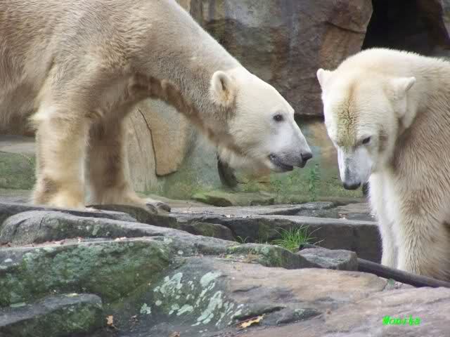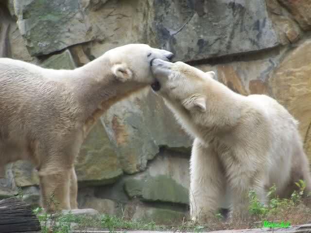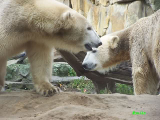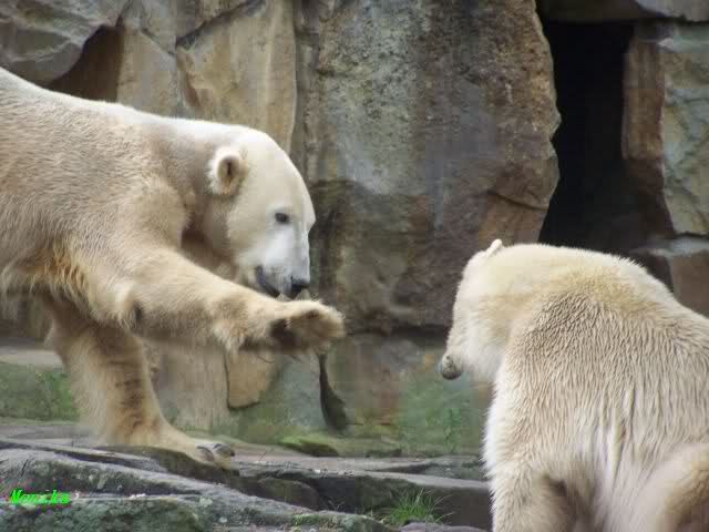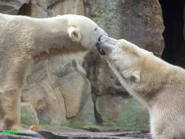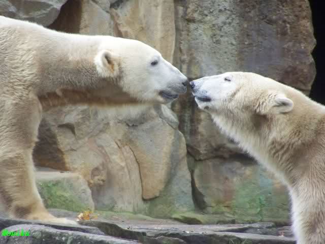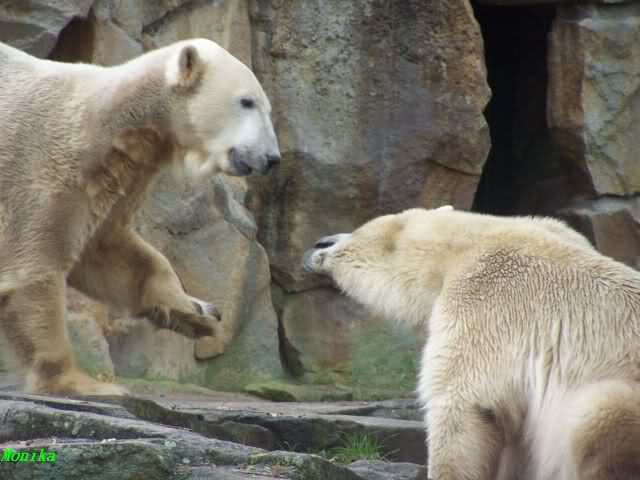 Ja, das war heute Vormittag schon sehr aufregend. Knut und Gianna lagen heute Morgen schon sehr dicht zusammen. Gianna machte 2 Annäherungsversuhe und Knut blieb liegen. Gegen Mittag animierte dann Knut Gianna zum spielen. Sie haben wirklich gute 10 Minuten ununterbrochen mieinander gespielt, sich zärtlich in den Nacken gebissen. Knut hob öfters einladend die Pfote um Gianna zum spielen aufzufordern.