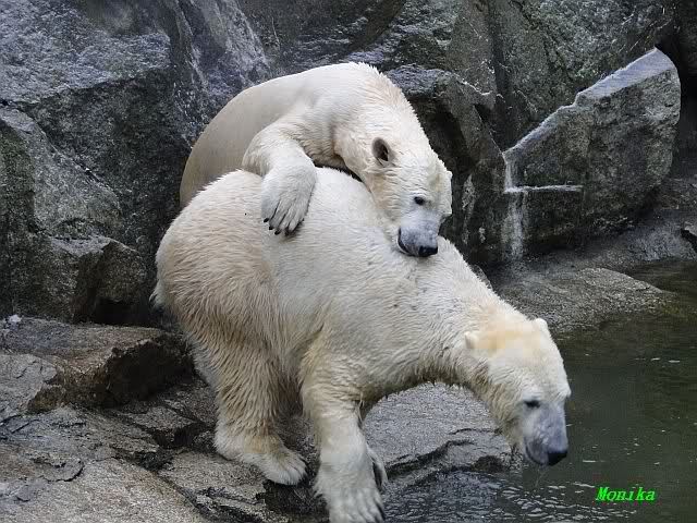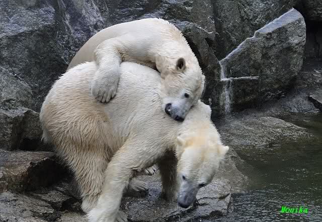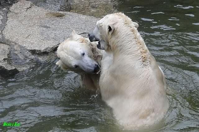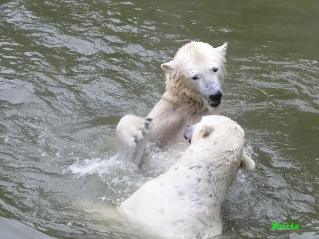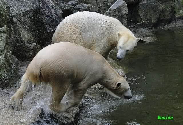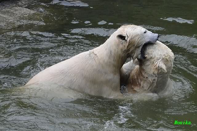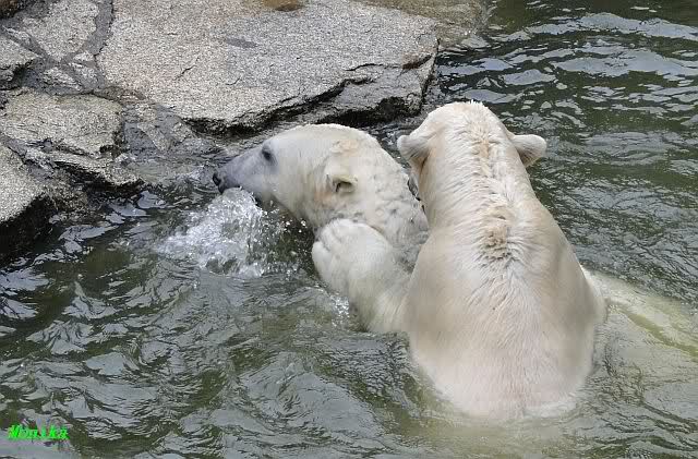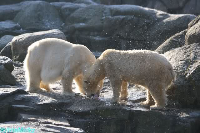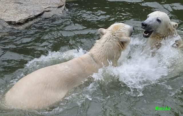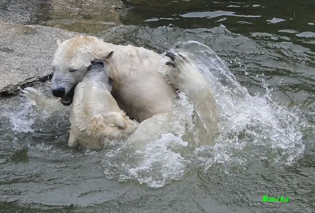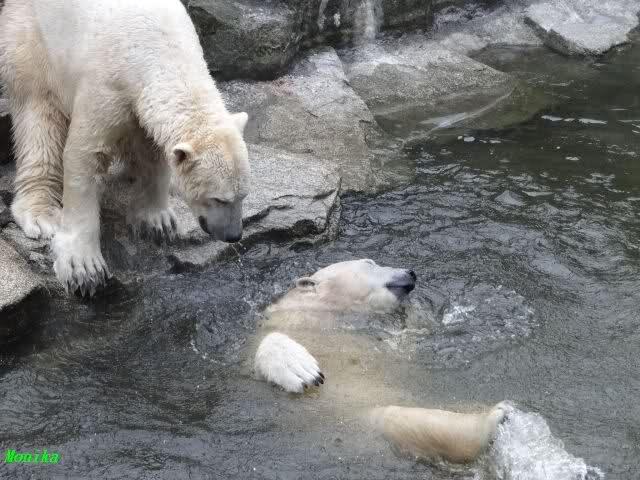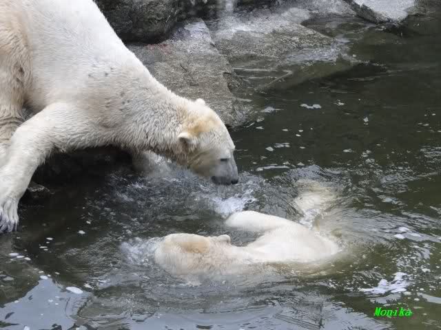 Heute Morgen haben Knut und Tosca erst einmal die Dicke der Eisschicht überprüft. Der Wasserzulauf war noch an. Tosca ging zuerst ins Wasser und animierte Knut auch hinein zu kommen. Der zierte sich noch eine ganze Weile. Da ging Tosca aus dem Wasser und packte Knut am Rücken und schubste ihn ins Wasser und dann begannen wieder schöne Wasserspiele. Ich finde, dass sie heute nicht so rabiat miteinander umgingen sondern eher soft.