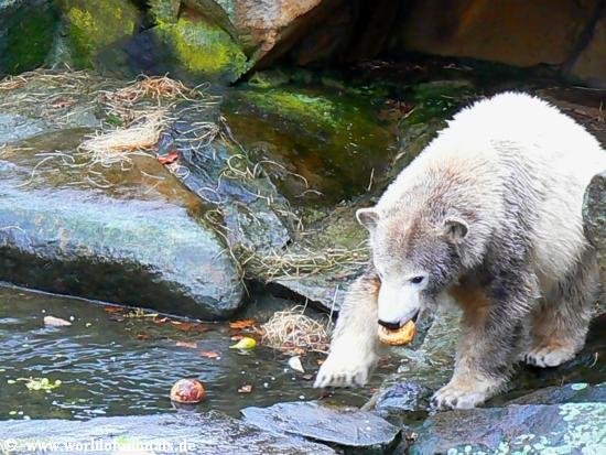 Sehr früh gab es heute Futter für Knut. Sein Ziehpapa Dörflein ist heute und morgen nicht da. Also fütterte eine Tierpflegerin. Es gab ein großes Stück Fleisch, ein Brötchen, einen Fisch, Salat und eine große Portion Weintrauben, die er als erstes futterte.