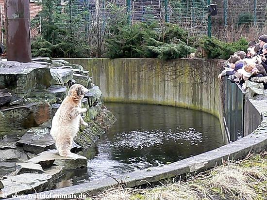 Auch eine dumme Unsitte von Besuchern ist es, an die Scheiben zu klopfen, damit der Bär reagiert. Besonders wenn er im Wasser ist und dann ganz dicht an den Scheiben aus dem Wasser herauskommt, mit seiner Schnauze an die Scheiben knallt. Verletzungen sind dadurch sogar möglich.