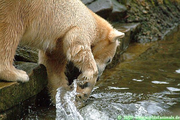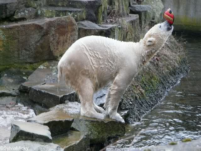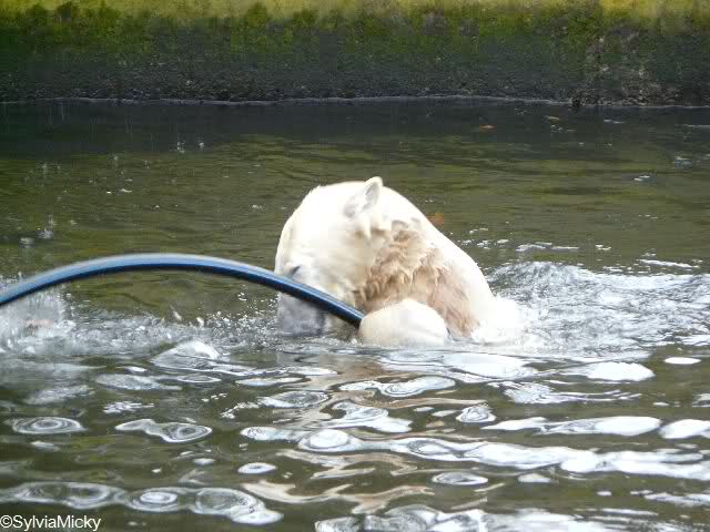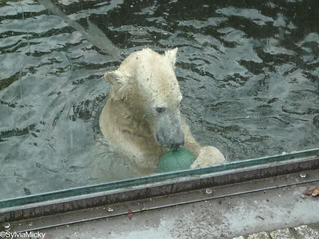 Heute Mittag spielte Knut fleißig Ball mit den Besuchern und tobte sich mit dem Schlauch und den Pflanzkugeln im Wasser aus. Einen Ochsenschwanz gab es auch am Vormittag.