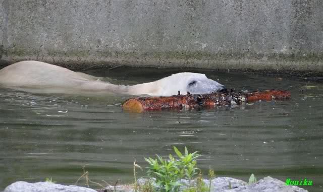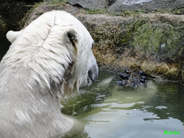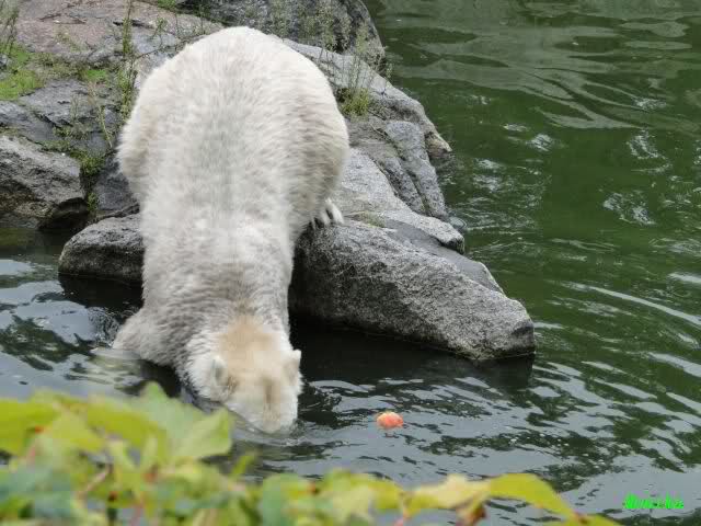 Ich wollte eigentlich heute morgen nur eine Stippvisite bei Knut machen. Als ich gerade gehen wollte, stand Knut auf und ging ins Wasser. Also blieb ich. Er schwomm erst ein Weilchen und fand dann reges Interesse an der Scheibe. Immer wieder kam er, als wollte er schmusen und gekrault werden. Wenn er die Hände an der Scheibe sah, drehte er seinen Kopf hin und her. Außerdem friemelte er lange untenterhalb der Scheibe. Man konnte ein knackendes Geräusch hören. Für kurze Zeit hatte er auch den Baumstamm in den Pfoten. Als er dann einen Zweig im Wasser fand und anfing zu spielen, kam Fr. Weckert mit dem Mittagessen. Knut reagierte erst nach einigen Rufen. Er kam ganz langsam angeschwommen. Die Fütterung lief ähnlich ab wie gestern. Als dann das große Weißbrot auch noch auf die ehemalige Insel von Lars viel, versuchte er immer wieder auf die Insel zu kommen, rutschte ein paar Mal ab. Nach Anfeuerungsrufen, auch durch die Pfleger, hat er es dann geschafft. Es folgte Applaus.Dann fraß Knut erstmal alles, was er auf der Insel fand. Als er dann wieder hinunter wollte, fing die Schnauze wieder an zu zittern. Aber nur kurze Zeit, dann war er im Wasser und beschäftigte sich lange mit einem Kürbis. Dann bin ich gegangen.
