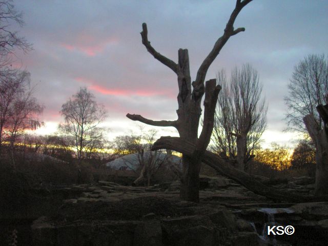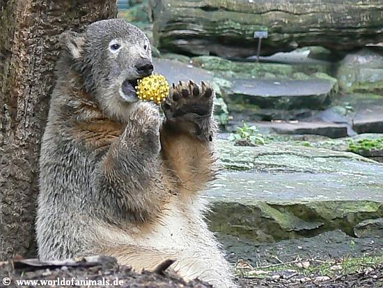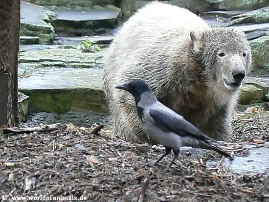 gestern war ich im Zoo. Als ich ankam lief Knut unruhig hin und her. Er wartete ungeduldig auf sein Nachmittagsessen. Es gab Brot, Fleisch,Fisch, Obst und Gemüse. Die Krähen sprangen ihm dabei immer vor die Nase um etwas abzubekommen. Mir fällt immer auf wie vorsichtig Knut die Weintrauben aber auch die Äpfel oder Birnen anbeißt. Danach schleppte er das Fleisch auf das Mulchbett und knabberte drauf rum. Immer begleitet durch die Krähen. Danach ging er wieder runter zum Wasser um einen Fisch aus dem kleinen Teich zu holen. Ich muß immer lachen, wenn er immer wütender auf's Wasser haut, wenn er den Fisch nicht bekommt. Er geht dann soweit wie möglich mit den Vorderpfoten ins Wasser. Bloß die Hinterpfoten nicht nassmachen. Dabei hatte er sich durch die Planscherei sowie so nass gemacht. Danach ging er nach oben und spielte mit dem Stock. Er stützte sich auf ihn und schaute uns an. Herrlich. Danach legte er sich hin. Ich habe dann einen Gang durch den Zoo gemacht und bin dann durch das Papageienhaus und den Freiflugraum gegangen. Sehr empfehlendswert bei kalter Jahreszeit.