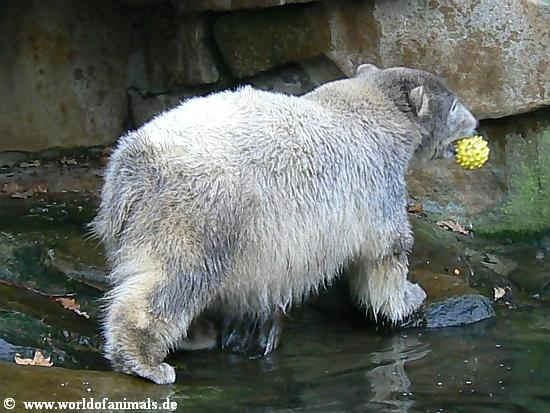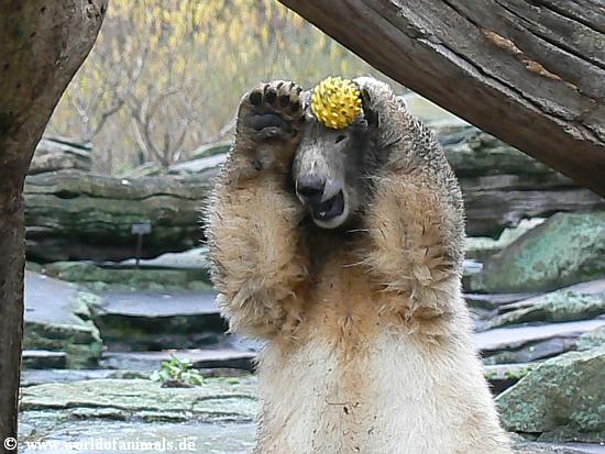 Knut, der Schwarzbär, so hätte man es auch heute Nachmittag wieder an seine Anlage schreiben können. Er sah aber auch wieder sehr andersfarbig aus...Er beschäftigte sich mit einem gelben Quietscheball und lieferte wieder eine kleine Knut Show