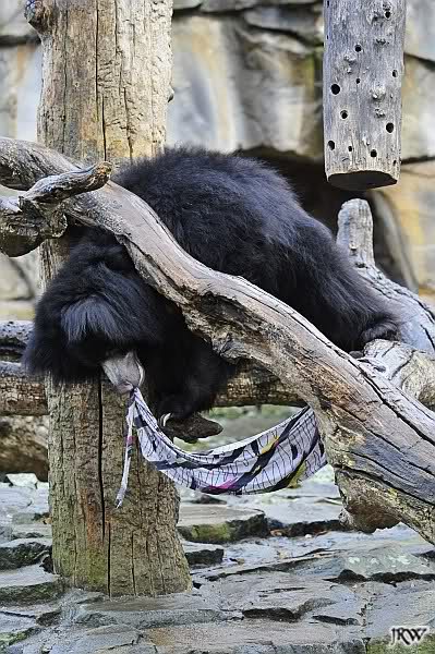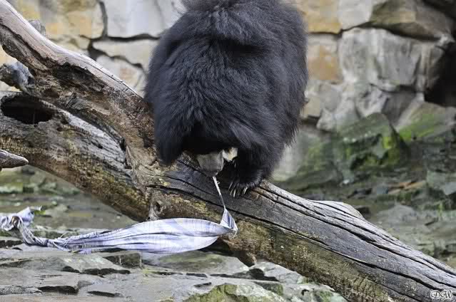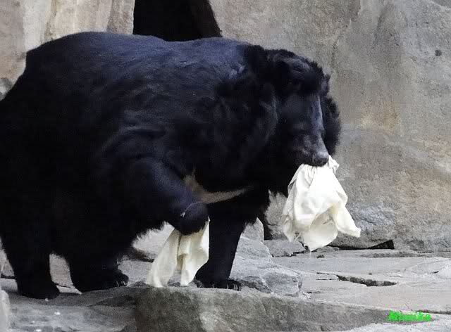 Als ich heute Morgen Richtung Eisbären ging, war der Kragenbär bereits auf der Anlage und gerade dabei ein großes Tuch zu zerfetzen. Auch Devi flitzte schon über die Anlage in ihre Höhle.