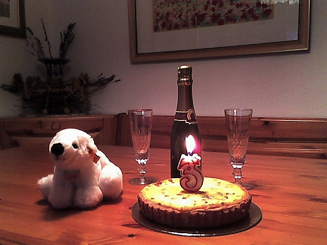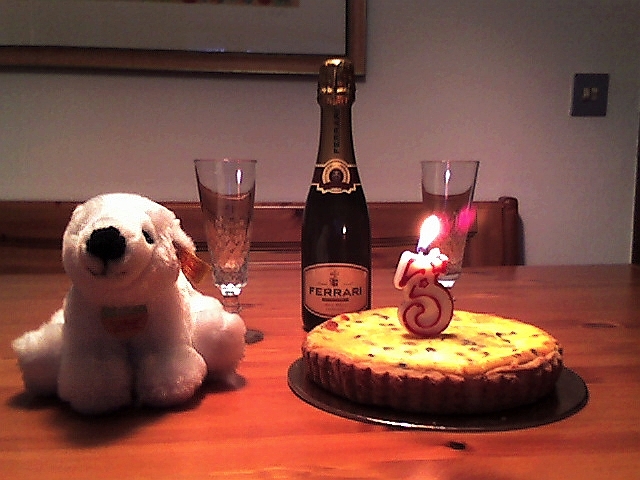 Im Süden Europas, in Italien wurde am 5. Dezember auch Knuts Geburtstag gefeiert. Patrizia hat mir heute zwei Fotos geschickt. Für sie und ihren Mann gehört Knut schon *fest zur Familie*. Daher gab es eine Käsetorte mit einem Licht, einer Drei, darauf. Dazu wurde eine kleine Flasche Sekt (man beachte die Marke) geöffnet.