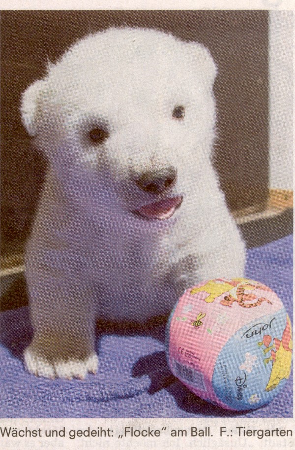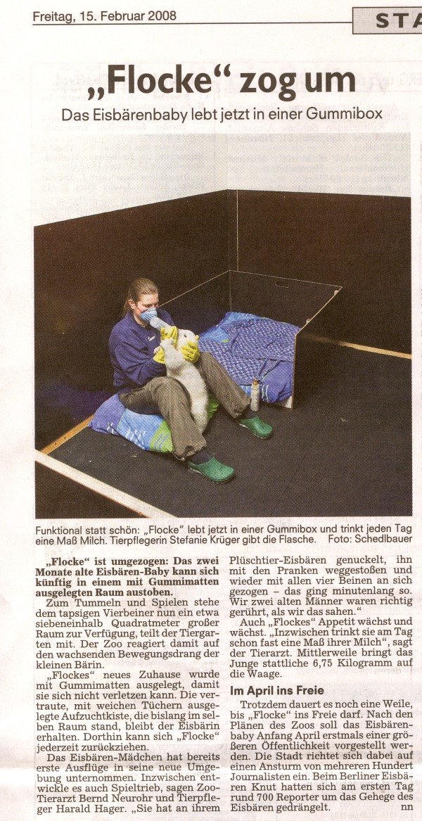 Heute Morgen, am 14. Februar 2008, wog Flocke 6,75 Kilogramm. Auch ihr Appetit wird immer größer: „Inzwischen trinkt sie am Tag schon fast eine Maß von ihrer Milch“, sagt Neurohr schmunzelnd.