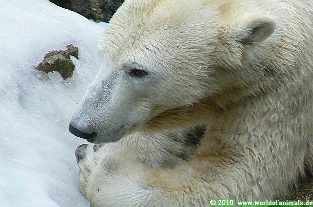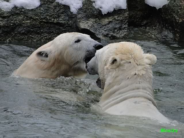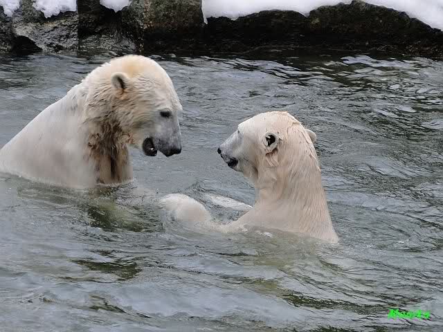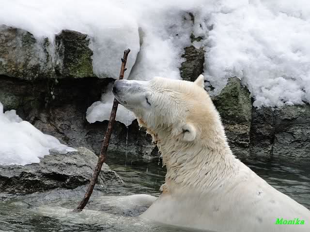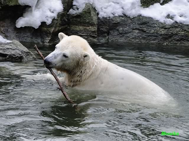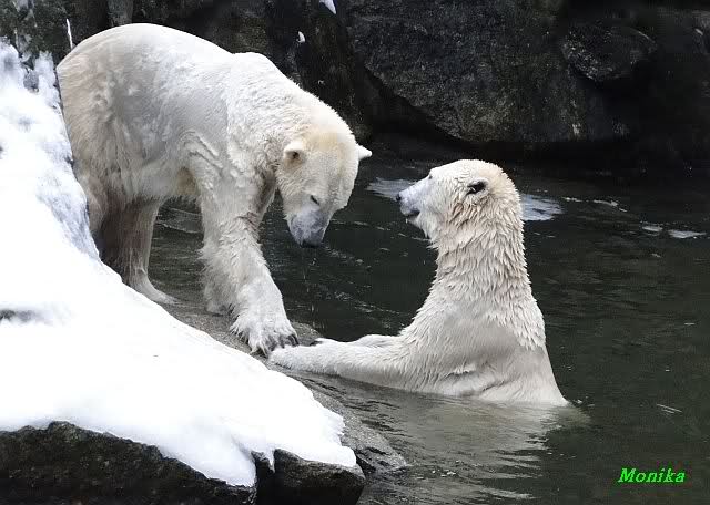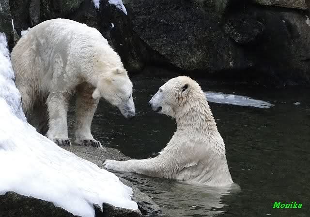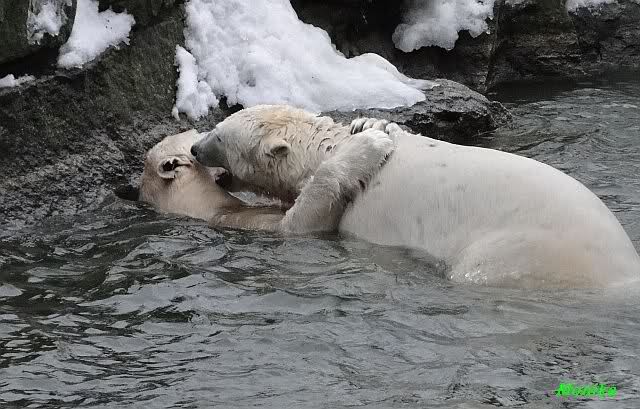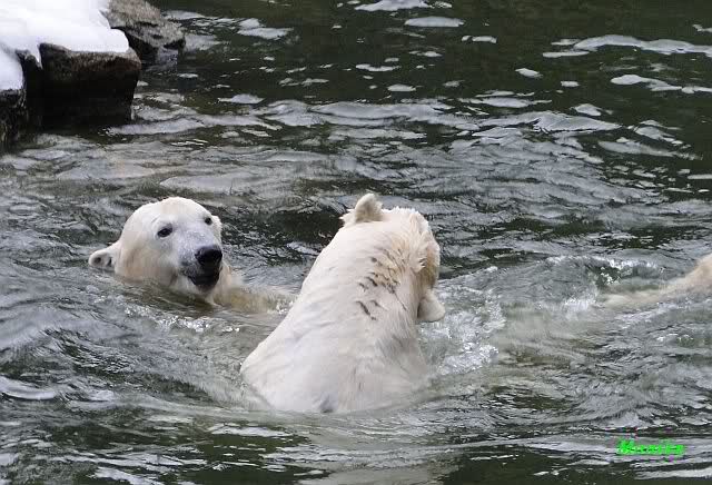 Knut jedoch war immer noch sehr munter. Er spielte noch lange im Wasser mit den Eisschollen. Insgeheim hoffte er wohl, dass Tosca auch kommt. Der Blick ging immer wieder nach oben. Als Knut dann doch müde wurde und nach oben ging, dachte er wahrscheinlich, dass die Mädels schon drinnen sind. Er ging auf die Anlage und schaute, konnte sie aber nicht entdecken. Erst als er auf dem mittleren Plateau stand, sah er sie. Er ging dann zu seiner Ecke und schloß auch die Augen.