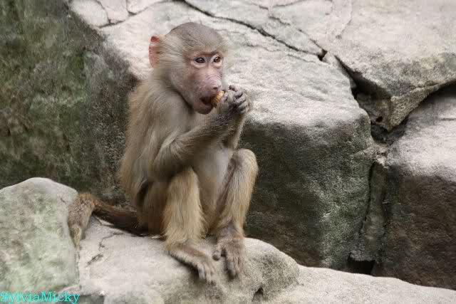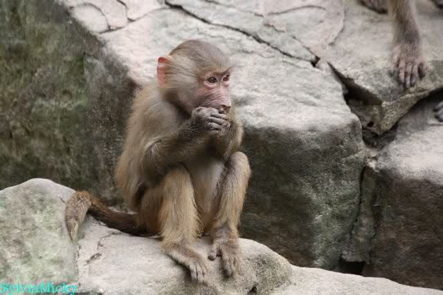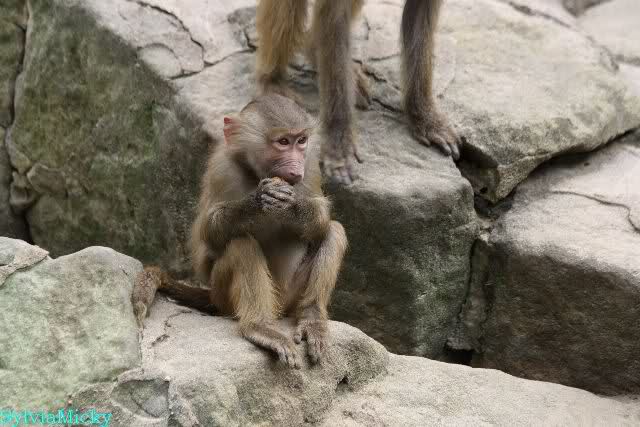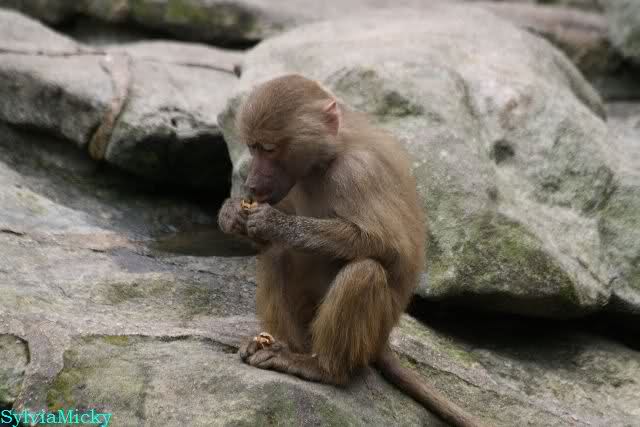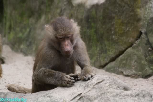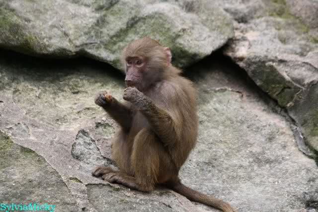 Die kleinen Mantelpaviane haben noch Schwierigkeiten die Nüsse zu knacken