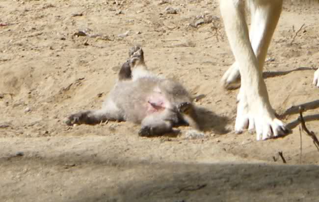 Mamma Wolf hatte einen Vogel zwischen den Zähnen, zuerst legte das Weibchen die Beute auf den Körper von Pelle, der legte jedoch wenig Wert auf dieses Federvieh. Aber ein kleiner Wolf kam angerannt und schnappte sich den Vogel und ist weggelaufen, wollte ihn alleine fressen, mutig! Aber die Beute konnte der kleine Wolf nicht lange behalten, die Mutter hat den Vogel ihr abgenommen, weggeschleppt und verspeist.
