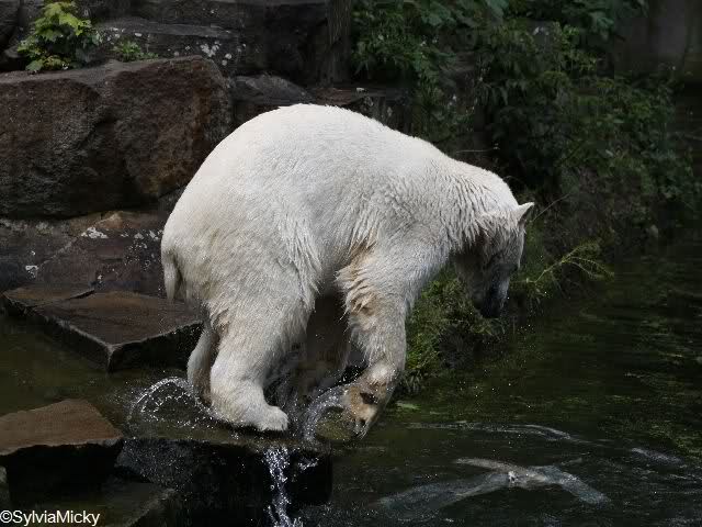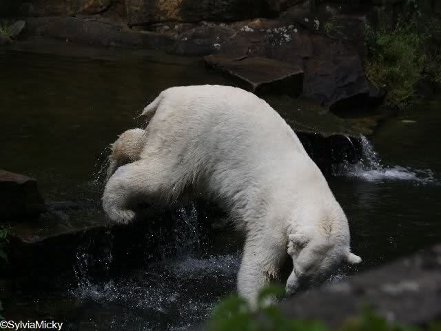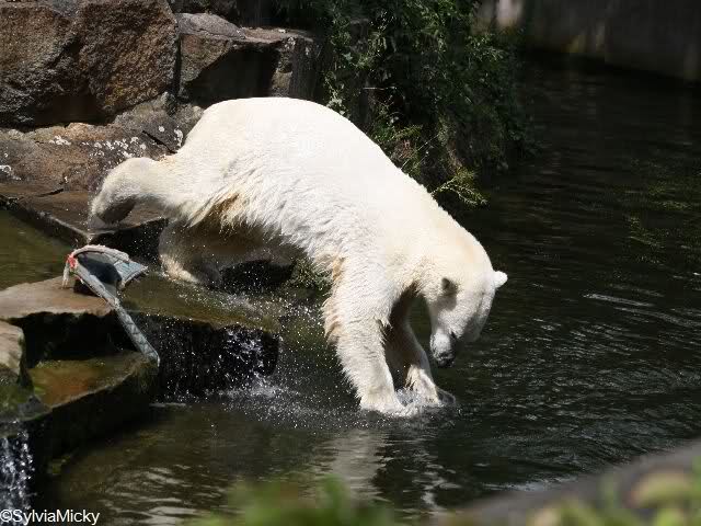 Heute war Knut bei dem schwül-heißem Wetter fast den ganzen Tag im Wasser. Gefüttert wurde er heute von Frau Weckert. Die frische Mittwochslachsforelle gab es heute auch wieder von dem netten Knutfreund. Heute früh überlegte Knut, wie komme ich an das Nackthuhn ran, daß auf dem Felsen lag. Schließlich ging er nach oben, rollte es den Felsen runter und sprang hinterher. Schlauer Bär. Heute war Knuts Tag der Sprünge. Vom Felsen und von rechts oder links vom Teich. Am Spätnachmittag tobte er immer noch im Wasser.