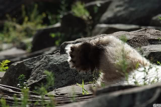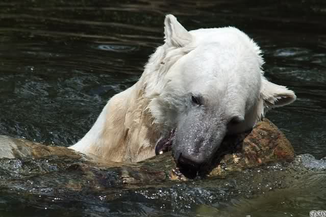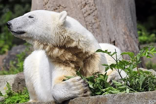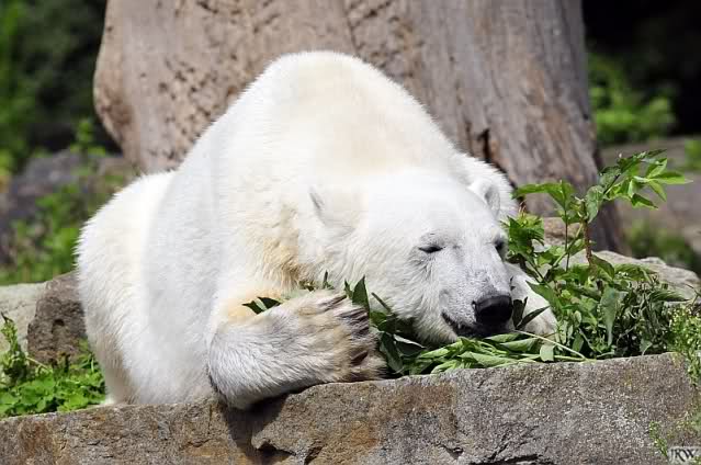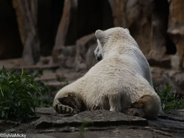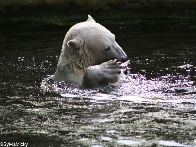 Knuti hatte heute eine Mahlzeit nach seinem Geschmack. Gut, dass er danach im Wasser herumtobte. Somit gab es kein Bauchgrimmen. Als er aus dem Wasser kam, lief er kurz über die Anlage, nahm sein Nackthuhn und besann sich dann doch eines Besseren. Schlafen war ein Weilchen angesagt. Vorher musste er sich kurz einfärben. Sobald sein Kopf verschwunden war, fingen die Knut-Rufe wieder an. Ein ganz kluger Besucher sagte nachem er gerade mal eine Minute in seiner Kuhle abgetaucht war, er solle doch endlich mal ins Wasser gehen.