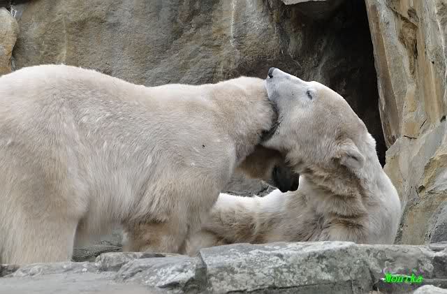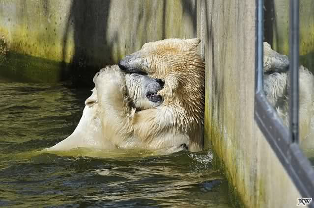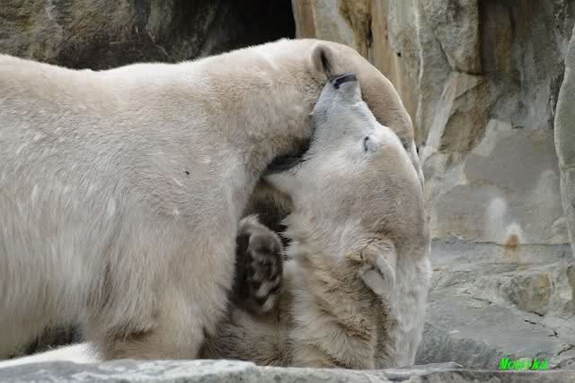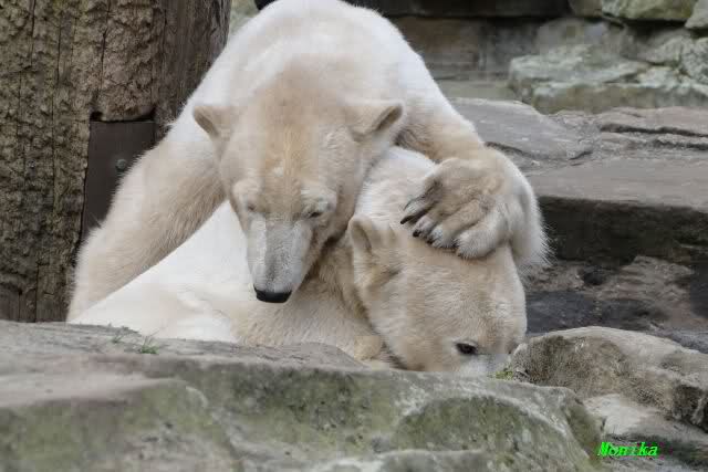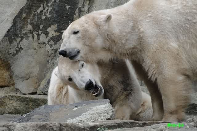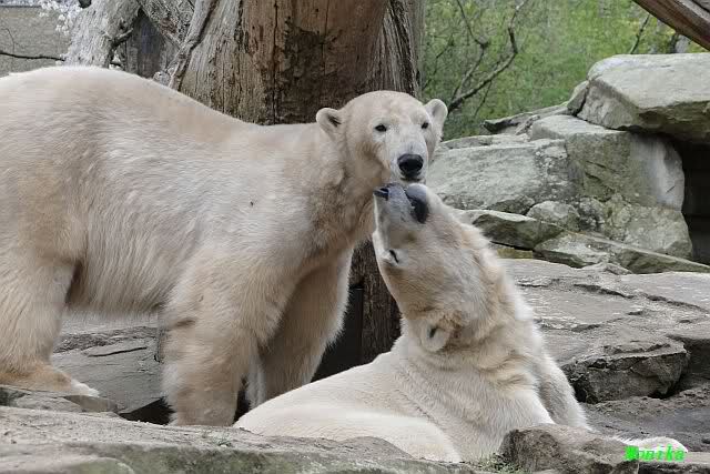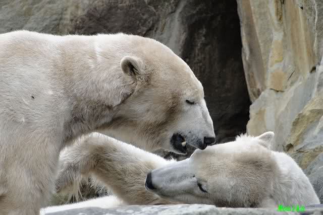 Ja Sylvia, heute ist es ein wenig ungemütlich, aber bei Knut und Gianna schien heute die Sonne. Ich würde den Vormittag so beschreiben: "Knut und Gianna in Love". Knut fing heute morgen schon an Gianna "anzubaggern". Sie ließ sich nicht lange bitten. Immer wieder wurde geschmust. Am schönsten war es als beide gemeinsam unter dem Baum saßen und schmusten. Es war sooo süß. Als ein kräftiger Graupelschauer aufkam, wurde im Wasser weiter geschmust und auch gespielt.