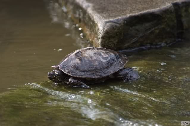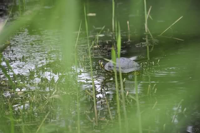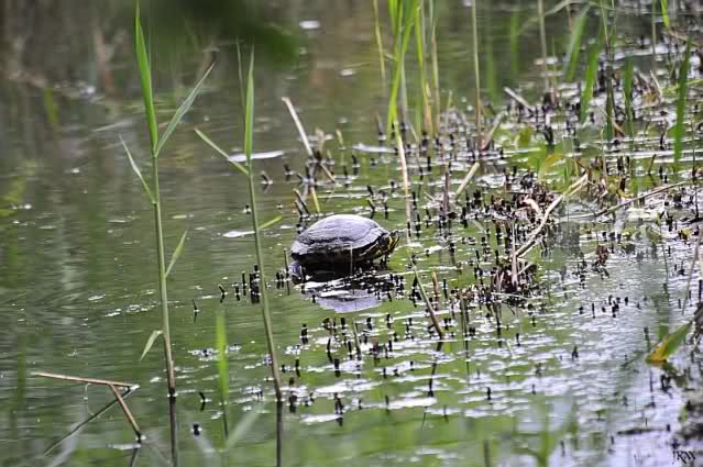 Gelbwangenschildkröte im Sumpfgebiet gestern. War es die ehemalige Untermieterin von Knut? Wahrscheinlich nicht. Es gibt mehrere, die dort herum schwimmen. Das Licht war nicht günstig, aber hier erschienen mir die Gesichtszüge anders .