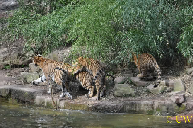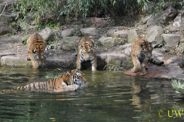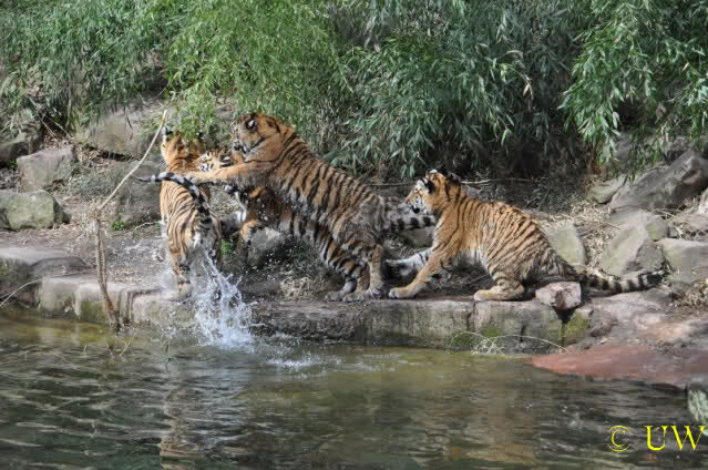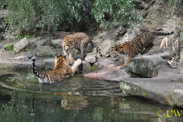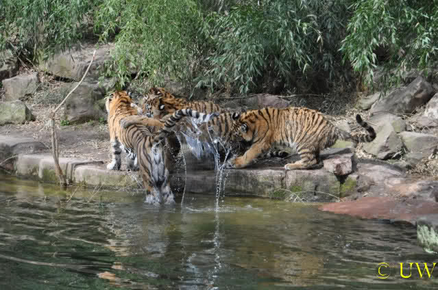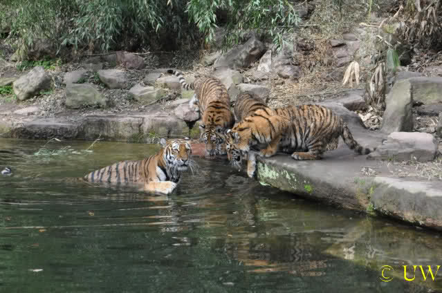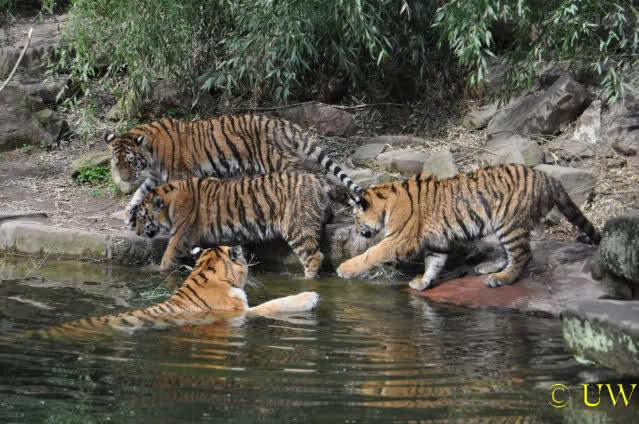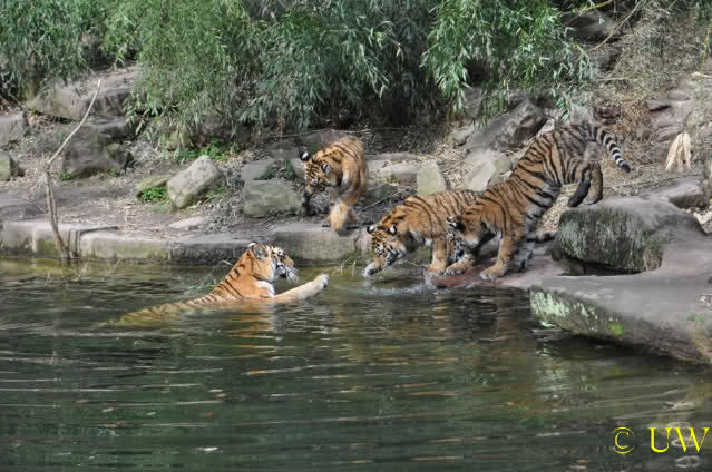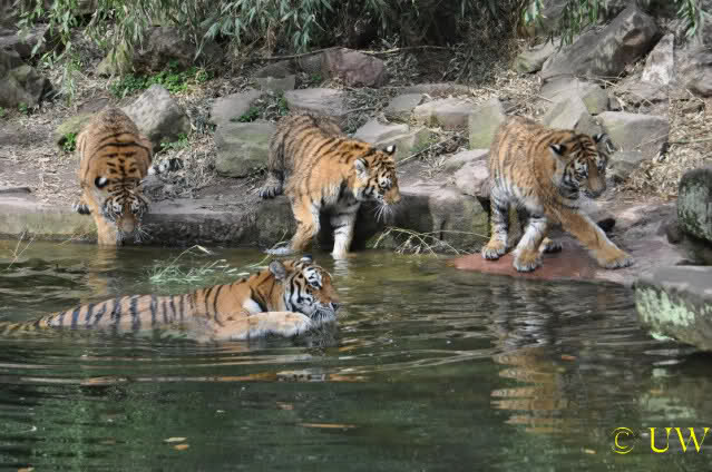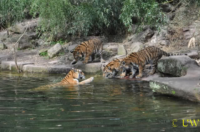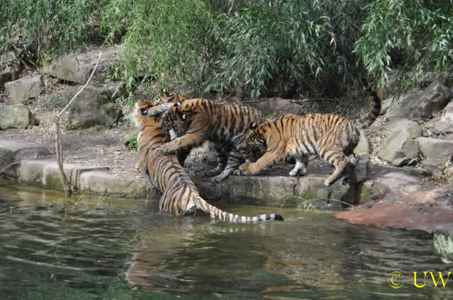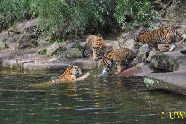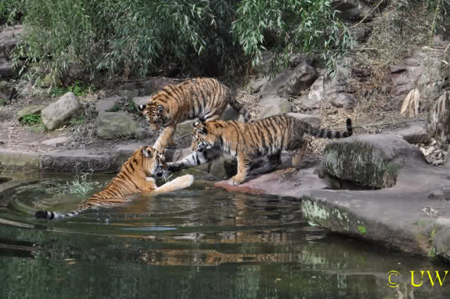 Die kleinen Tiger ärgern ihre Mutter und wollen sie nicht aus dem Wasser lassen