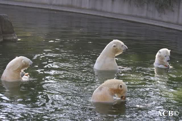 Wie Sylvia schon oben geschrieben hat, war heute eine Kindergruppe bei den großen Eisbären. Deshalb gab es eine willkommene Nachmittagsspeisung. Alle vier haben es genossen: