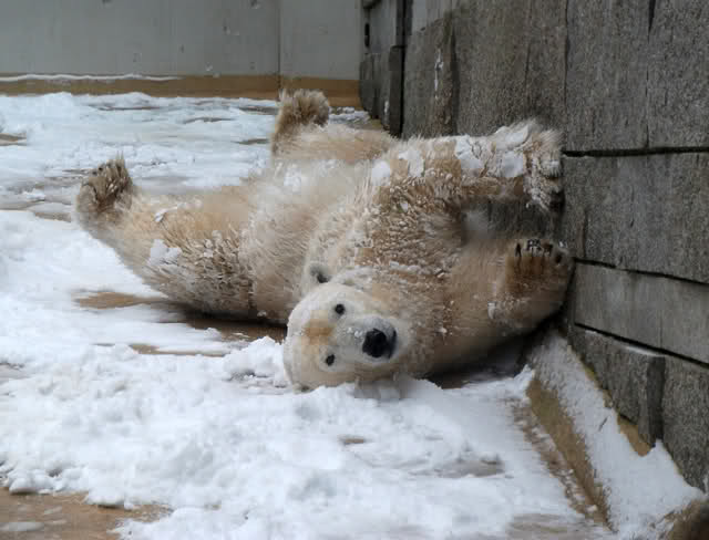 Und jetzt im großen Gehege auch! Dazu braucht man nicht Jahre, sondern ein paar Tage, allerhöchstens eine Woche, um etwas Sand, einen Baum oder sonstiges auf die Eisbärenanlage zu bringen, geschweige denn Beschäftigungsmaterial auf die Anlage zu werfen (und nicht nur eine Baumwollhantel!)