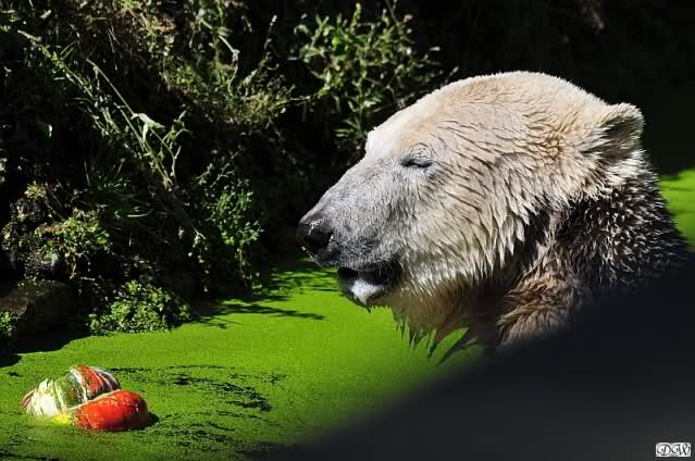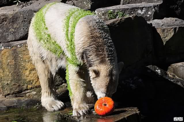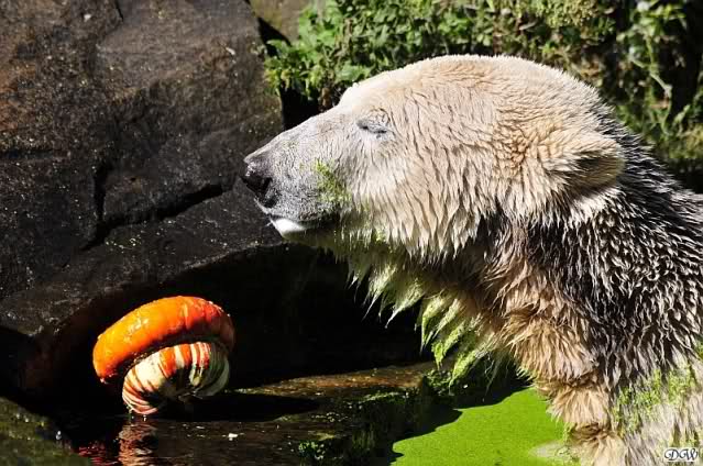 Die Fütterung wurde heute von Frau Weckert durchgeführt. Zum Abschluss bekam Knut einen hübschen Kürbis mit dem er so lange beschäftigt war, dass er fast Herrn Henkel auf der anderen Anlage verpasste. Gerade noch im letzten Moment schnellte sein Kopf hoch, Nase in der Luft und er war dann schnellstens auf der Anlage. Natürlich hatte Herr Henkel wieder etwas für ihn, diesmal war es ein Fisch.