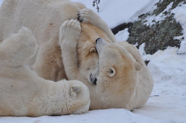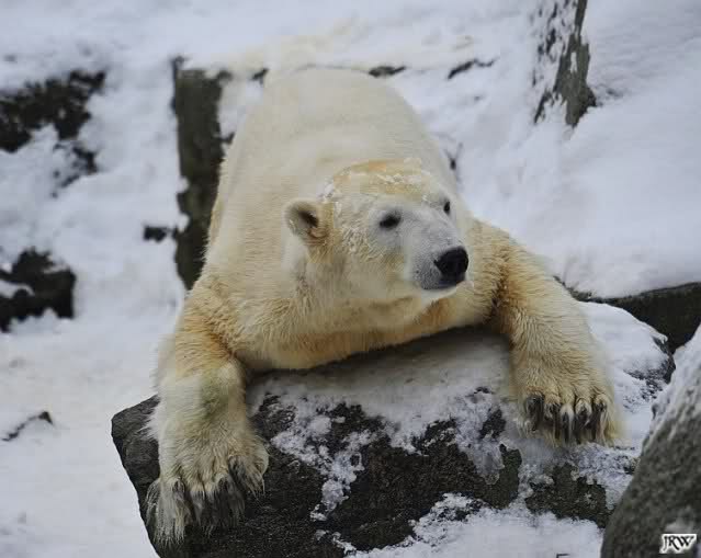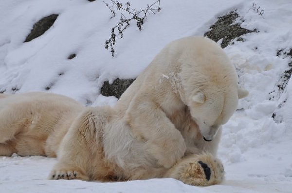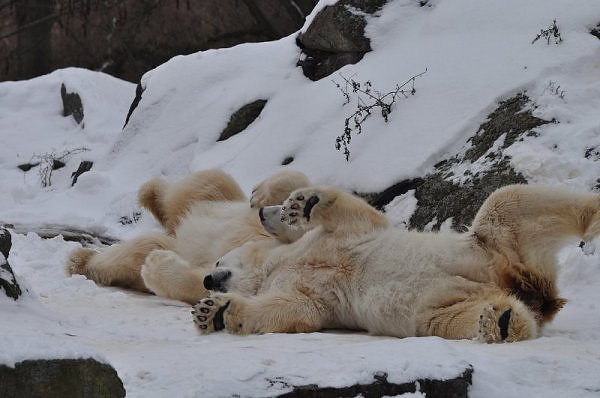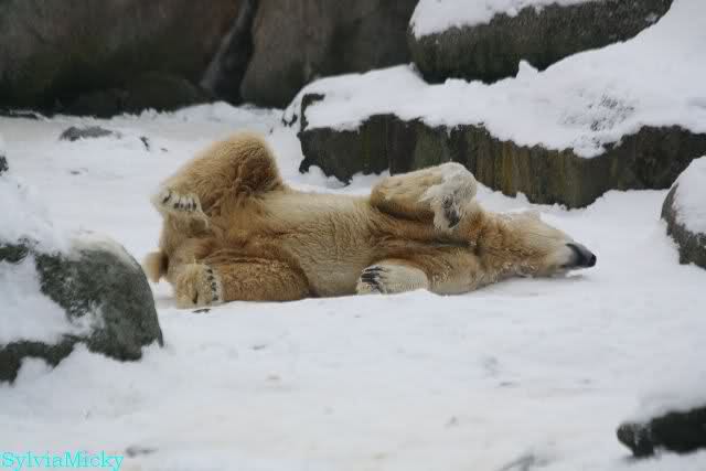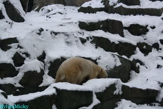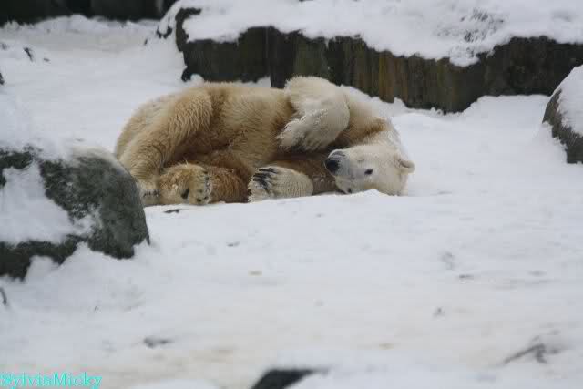 Dann ging er auf die Anlage und rollte sich auf dem mittleren hinteren Teil im Schnee. Und das obwohl die Bärinnen auf der Anlage waren! Tosca und Nancy lagen hinten rechts. Kati sah ich nicht.