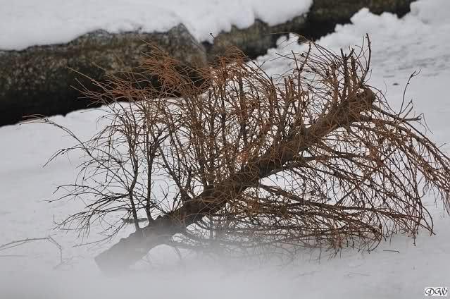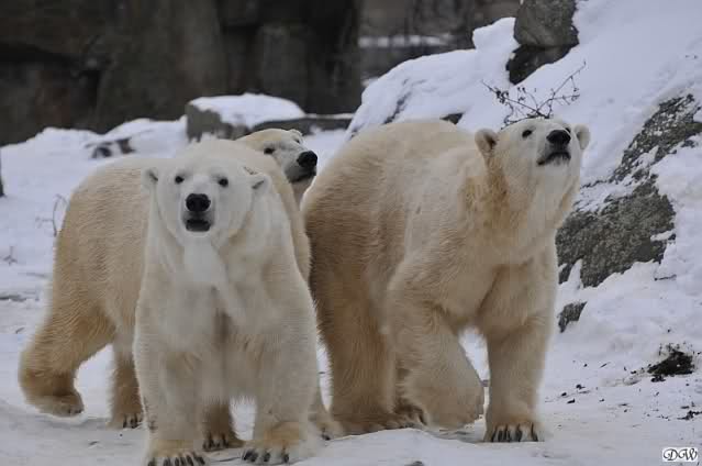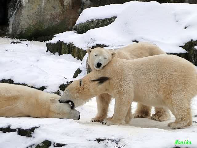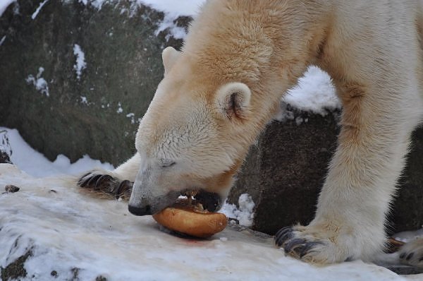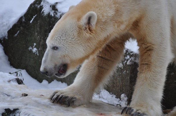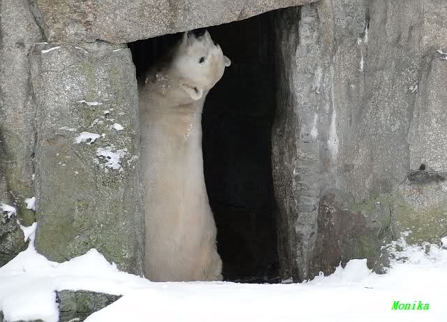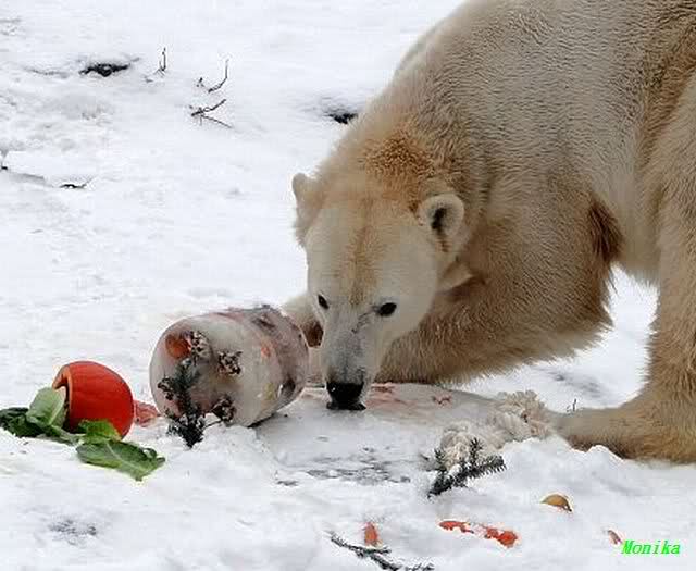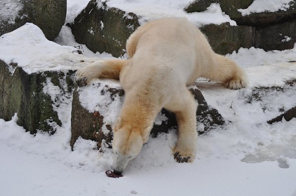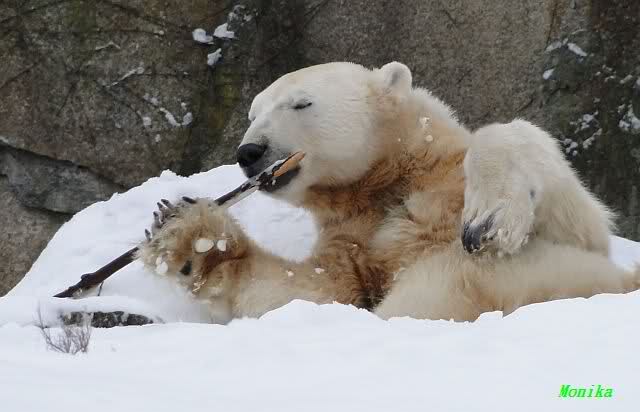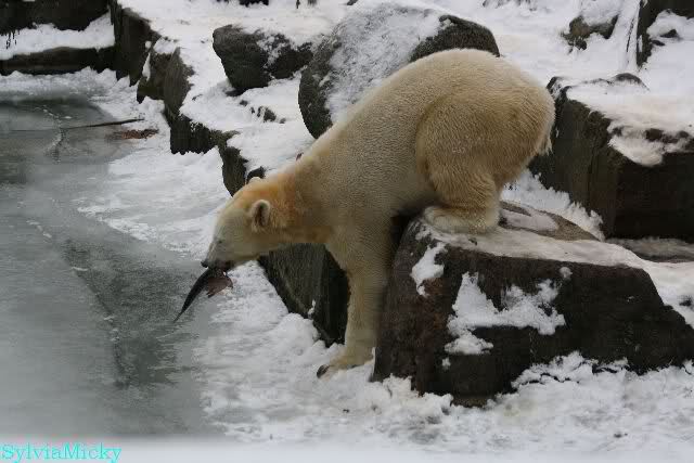 Knut bekam auch noch einen Lachs. Als Kati ankam, trug er den Fisch auf die Anlage. Zum Glück wurde Kati durch den Baum (der Grüne), der auf dem Eis lag, abgelenkt. Sie zog ihn auf die Anlage und wollte ihn auf die Anlage tragen. Dann kam Tosca. Aber so interessant war für sie der Baum nicht. Als Knut auf seine Ecke wollte, lag da der Baum. Er ging vorsichtig hin und beschnupperte ihn. Da sah man deutlich den Unterschied im Verhalten zu den anderen Bären. Während Kati den Baum fast zerlegte und Tosca auch keine Angst zeigte, war Knut sehr vorsichtig. Als der Baum sich bewegte, weil er direkt auf der Ecke lag, ging Knut vorsichtshalber einige Schritte zurück.