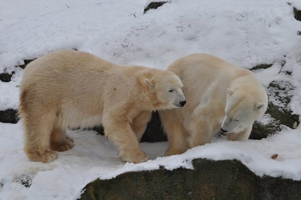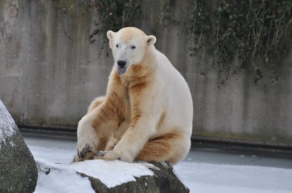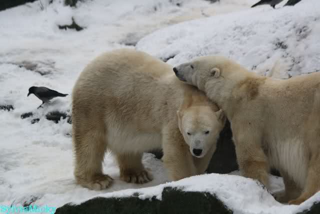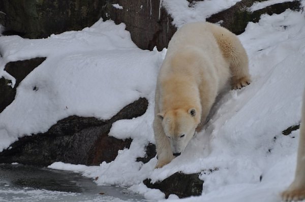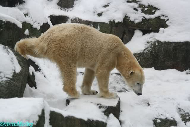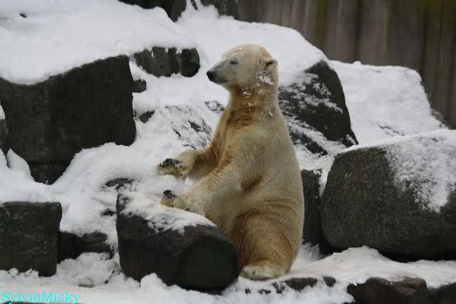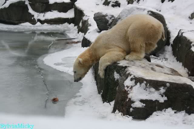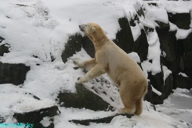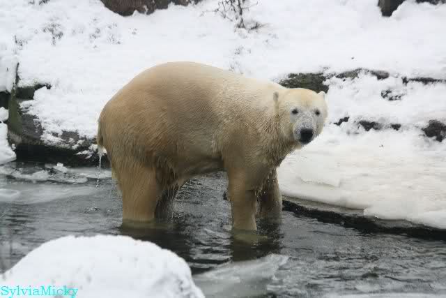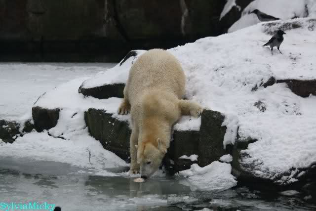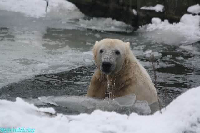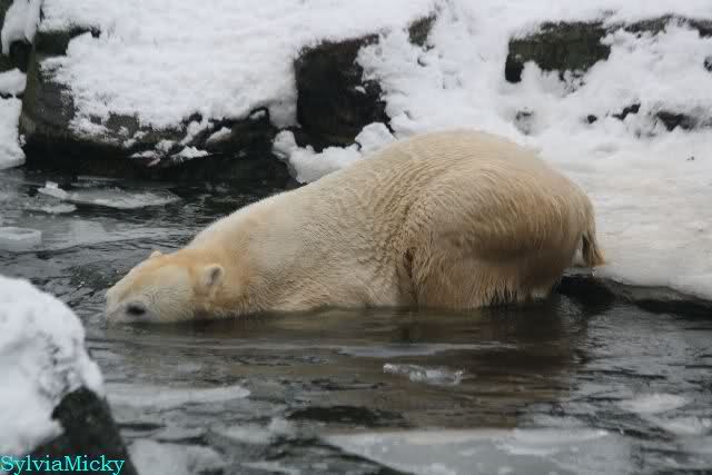 Das ging eine Weile so, bis die übergewichtige Spielverderberin angepest kam. Es gab dann lautes Gefauche und Gebrumme und Knut ging wieder auf die untere Seite und versuchte sich dort an den Steinen zu schubbern. Dann ging er zum zweiten Mal ins Wasser. Rieb sich dann aber vorsichtshalber vorne rechts im Schnee.