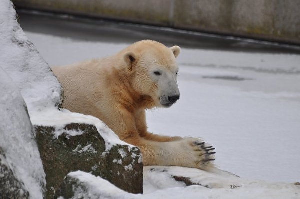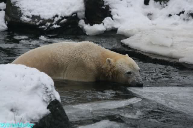 Vor der Fütterung lag er wieder auf seiner Ecke. Zur Fütterung bekam er u.a. einen schönen großen Lachs. Nach der Fütterung legte er sich wieder auf die Ecke. Ich betrachtete Tosca, Nancy und Kati die auf der Anlage sehr schön schmusten. In der letzten Zeit sehe ich die Drei öfters zusammen liegen, obwohl ich den Eindruck habe, daß es Nancy nicht immer paßt. Ich wollte noch ein Foto von Knut machen und dann gehen, weil ich schon sehr durchgefroren war. Knut war aber nicht auf seiner Ecke. Also wieder Treppen runter, Treppen rauf. Er war im Wasser und schwamm zwischen den Eisschollen. Er schaute auf die vordere Insel und hielt sich an einer Eisscholle fest.
