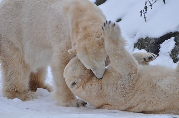 Knut flüchtet vor Kati mit dem Lachs auf die Anlage