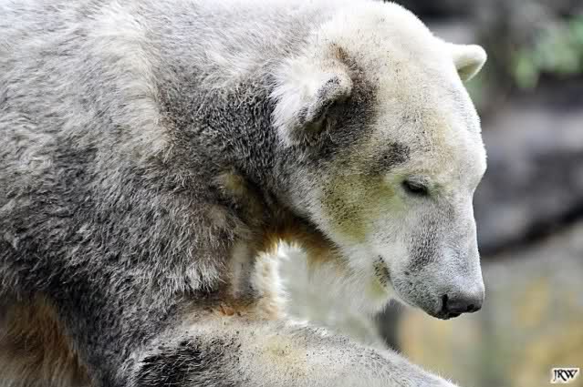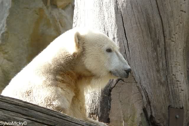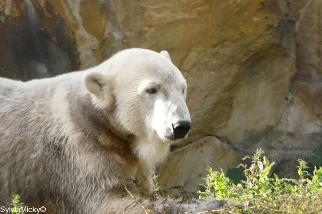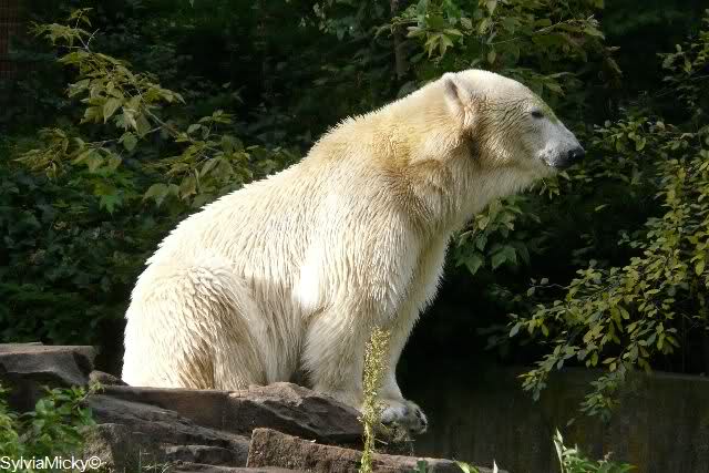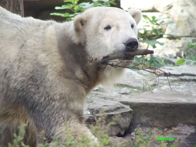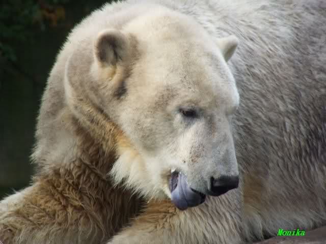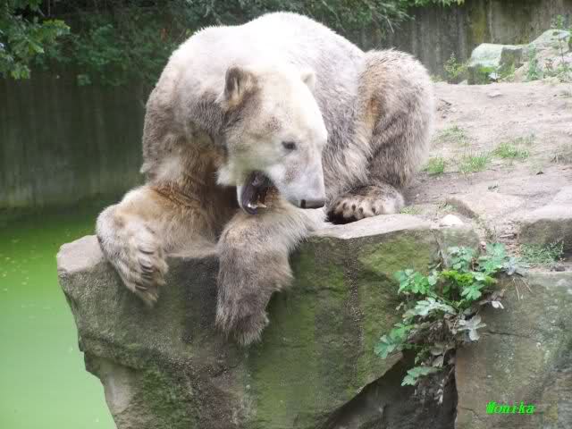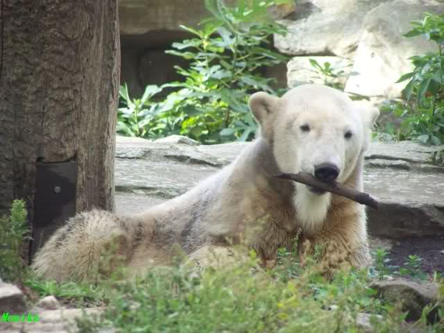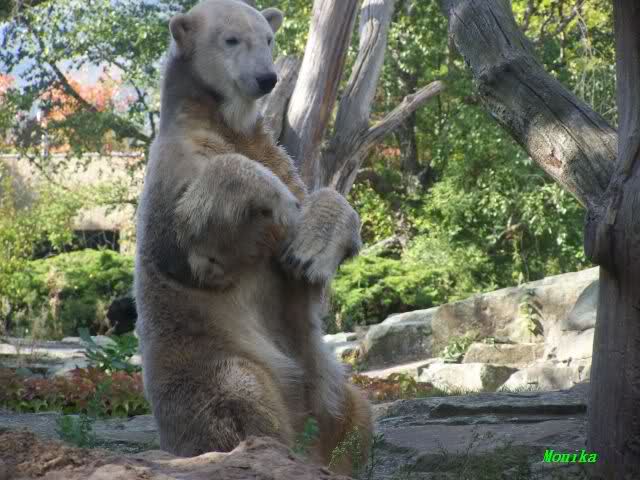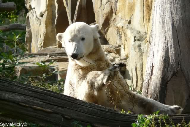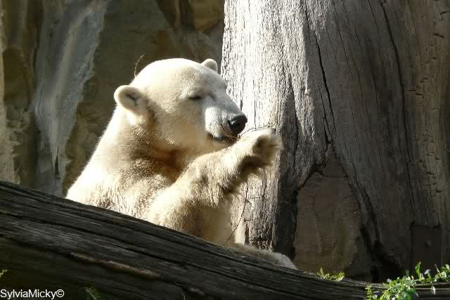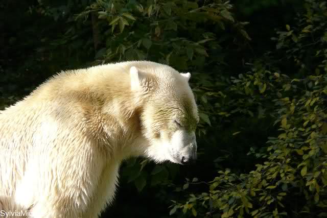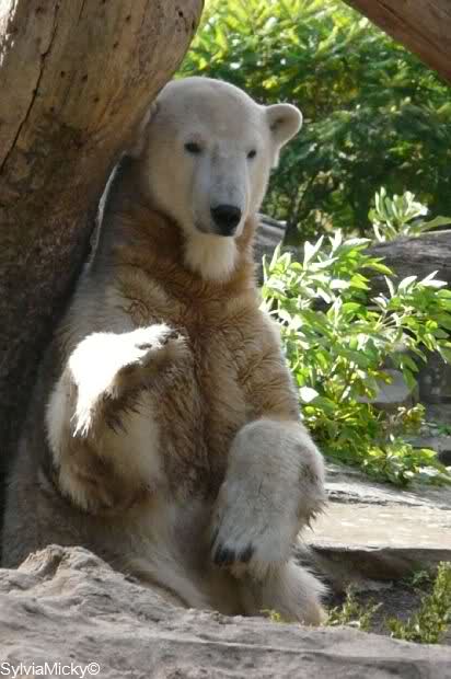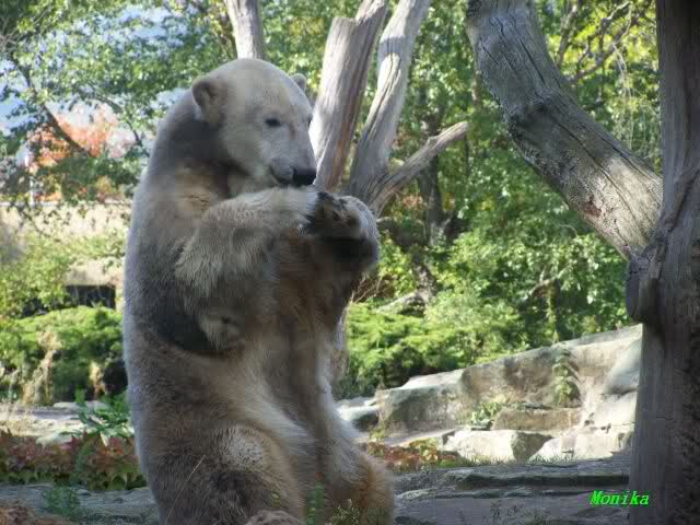 Als ich gegen 18.00 bei Knut nochmal vorbei ging war von ihm nichts zu sehen. Ich denke, er ist in einen komaähnlichen Schlaf gefallen. Eine Stammbesucherin erzählte mir, daß Knut heute seinen Sandhaufen mit Fauchen verteidigt hat. Kurz nach der Fütterung sagte sie, spielte Knut mit einem Ball im Wasser. Gianna wurde dann rausgelassen und Knut lief auf die Anlage. Heute Nachmittag sah man bei Knut öfters die vorgeschobene Lippe.