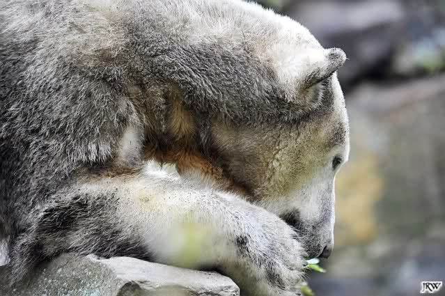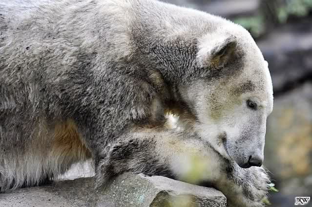 Wie ich ja heute Mittag schon erwähnte, hat Knut heute lange geschlafen und Gianna kam erst um 10.00 Uhr auf die Anlage. Nachdem Knut von Herrn Röbke geweckt wurde, hatte er nun wieder zu tun, um seine Mitbewohnerin zu beobachten. Außer den 2 kleinen beschriebenen "Attacken" war es am Vormittag sehr ruhig. Gianna schwamm wie immer ihre Runden und Knut war auf Beobachtungsposten, und noch sehr müde. Ihm fielen immer wieder die Augen zu. Gianna schaute auch heute ständig zu den Braunbbären und sprang dann sofort ins Wasser. Einmal hatte sie kurz den großen Baumstamm in den Pfoten. Es sah aus, als wolle sie damit spielen. Sie ließ ihn aber dann doch wieder fallen; war ihr wohl zu schwer.