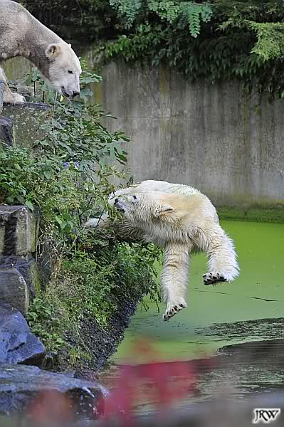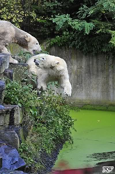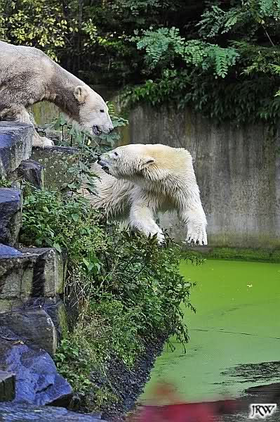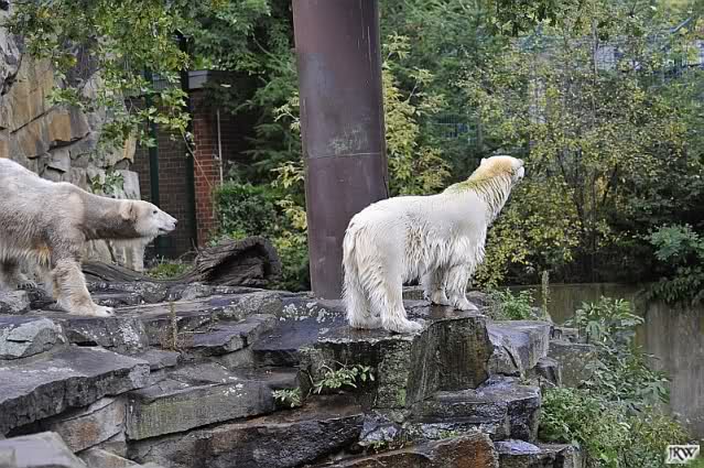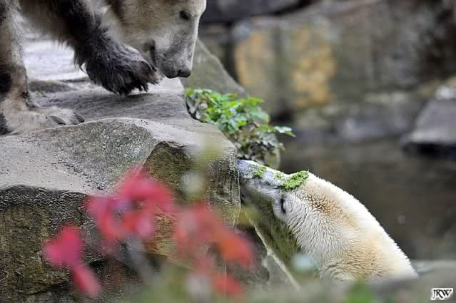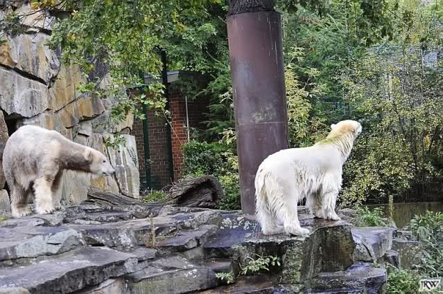 Knut and Gianna today in a video by Jessie. There are some interesting scenes, for example right in the beginning Gianna walks across the enclosure looking for Knut who ist sleeping, she finds him and licks him shortly or when Knut tries to pinch Gianna's behind and what happens then. For a second, the visitors were holding their breath.