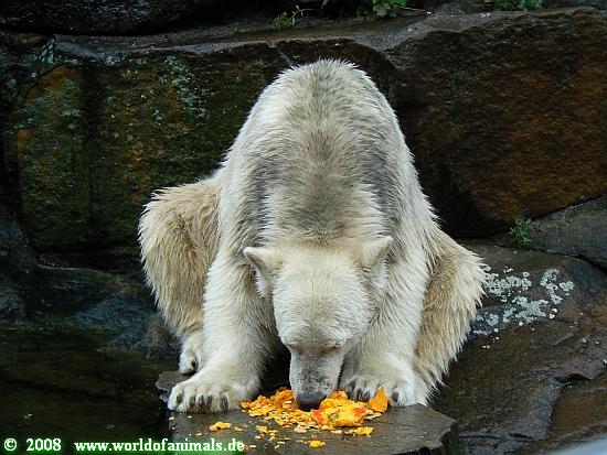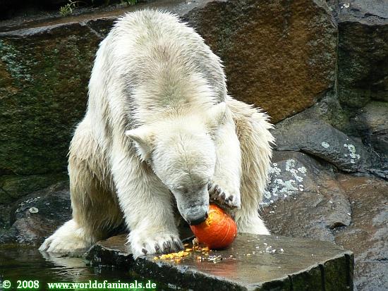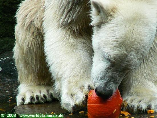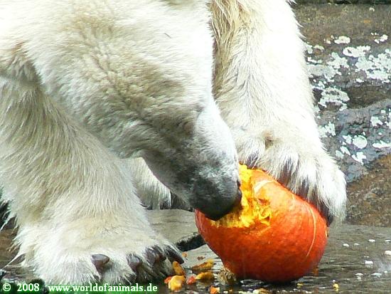 Ich suchte mir wieder einen leidlich guten Platz, von dem aus ich die Fütterung gut verfolgen konnte. Knuts Appetit ist jedenfalls hervorragend. Auch der Kürbis war nach kurzer Zeit im Bären verschwunden.