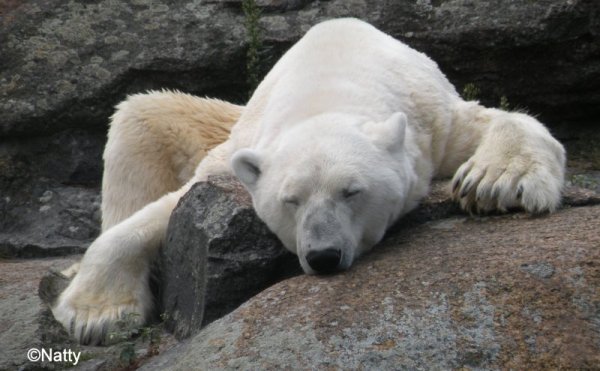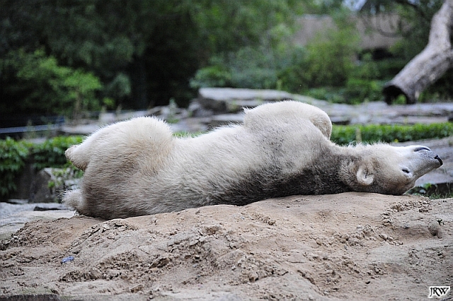 Dann gingen wir wieder zu Knut zurück. Der hatte inzwischen glücklicherweise seine Wanderung beendet. Zunächst gärtnerte er ein bisschen, das heißt, er riss einige Pflanzen aus und trug sie herum. Dann legte er sich hin und seine Augen wurden immer kleiner. Knut hielt ein Schläfchen. Schließlich stand er auf, ging zu seiner Höhle und kuschelte sich in den Eingang.