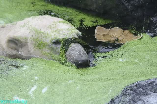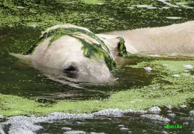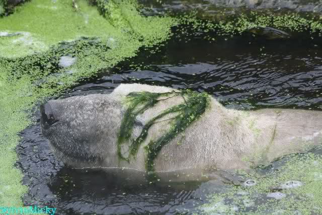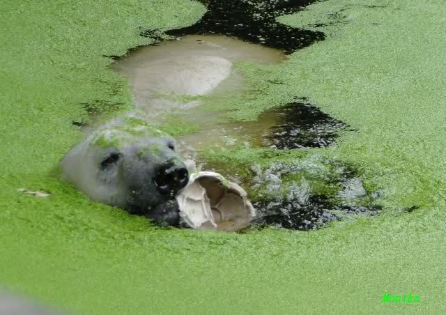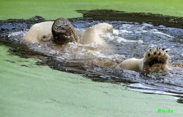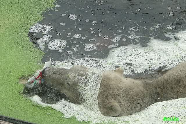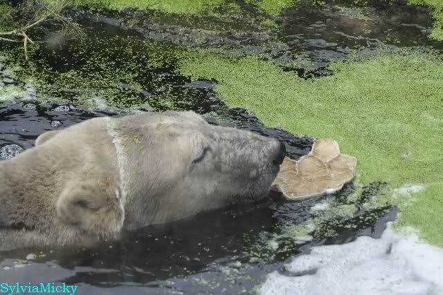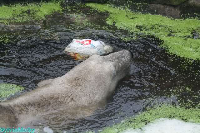 Heute Morgen hat Knut wieder lange geschlafen. Er brauchte eine Weile um richtig munter zu werden, und ging dann ins Wasser. Er spielte den ganzen Vormittag mit allem was er im Wasser fand. Außerdem übernahm er Giannas Part und spielte Staubsauger. Er tauchte immer wieder ab und kam kauend wieder hoch.