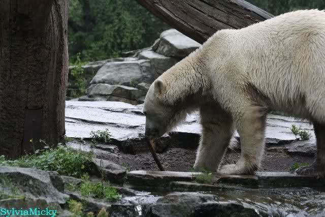An einem sehr regnerischen Morgen war Knut schon früh im Wassergraben. Etwas später lief er auf die Anlage und knabberte an dem Kauknochen. Während der Knochen bei den Großen Eisbären völlig aufgelöst ist und aussieht wie ein breites Band, ist bei Knut erst das oberste Teil abgeknabbert. Er wird noch lange damit beschäftigt sein. Wenn er nicht dran knabbern wollte, buddelte er ihn in der schwarzen Sandkuhle ein.