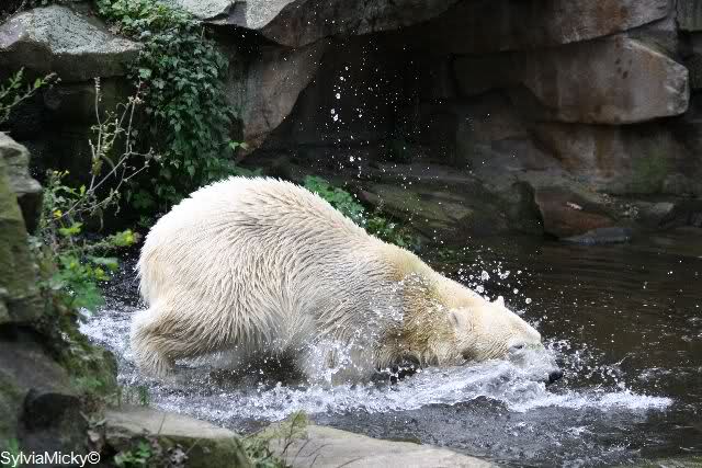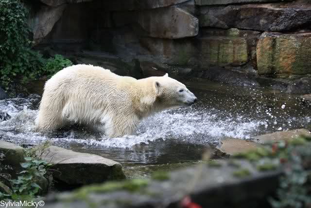 Als Knut in seinem kleinen Pool war, kam Gianna aus dem Wasser und sie waren sich für einen Augenblick sehr nah. Sie hoben beide die Tatzen und berührten sich, als wollen sie miteinander spielen. Aber Knut legte dann doch wieder den Rückwärtsgang ein. Das ging alles so schnell, dass meine Kamera streikte.