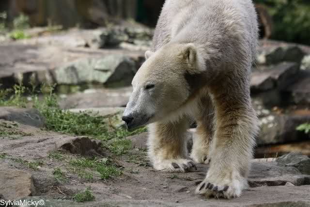 Wie hier schon geschrieben wurde, läuft das Kennenlernen immer besser. Nur als sich Gianna nochmal im Sandhaufen suhlte, gab es bei Knut eine nach vorne geschobene Oberlippe und er schnaufte. Sie hat es verstanden und trollte sich. Ansonsten hat sie immer noch Angst vor den Braunbären und springt dann meistens ins Wasser. An seinem Futter ist sie nicht interessiert. Mittlerweise bleibt Knut öfters liegen, wenn sie vorbei läuft oder er pfriemelte an den Gräsern.