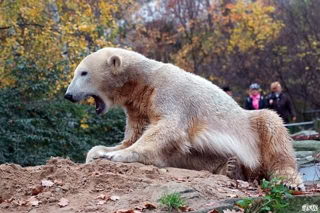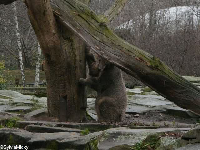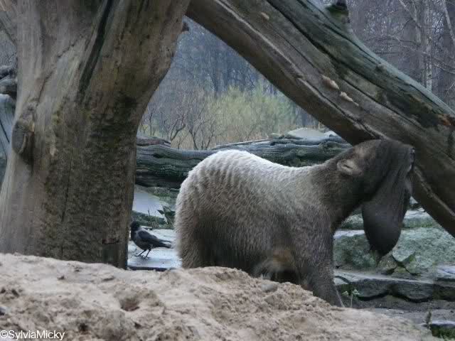 Bei den Braunbären nebenan versuchte Berni mühevoll, in den leeren Wassergraben zu kommen. Dort gefiel es ihm aber nicht. Also kletterte er wieder an Land und arbeitete eifrig an einer Kuhle, die er gegraben hatte. Schließlich setzte er sich dort hinein. Zwei Damen unterhielten sich eingehend über Bernis Gesundheitszustand. Ein Mann meinte, er käme sich hier vor wie bei der Chefarztvisite.