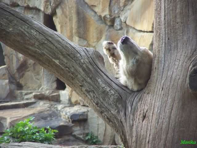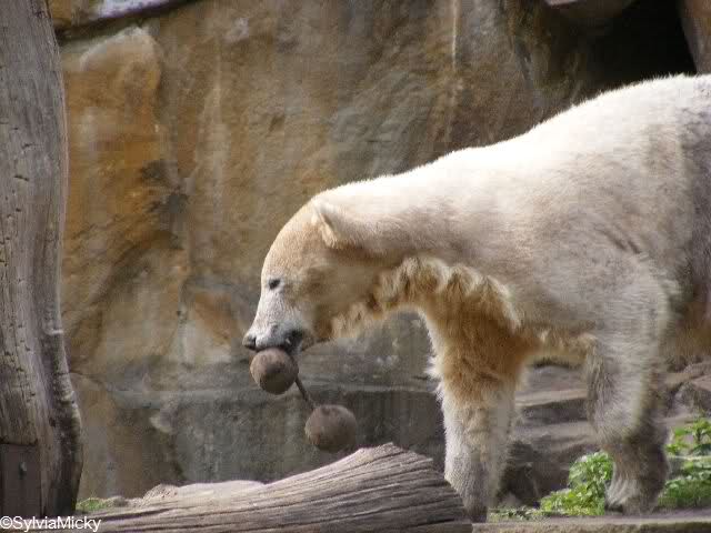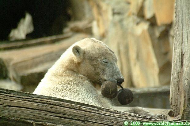 Nach der Fütterung spielte Knut ausgiebig im Wasser mit seinem Nackthuhn. Es wurde am Baum geschubbert und dann noch mit den Doppelkugeln gespielt. Am Spätnachmittag legte er sich auf seinen Stein und schlief. Zum Glück war der Knutbrüller nicht da.