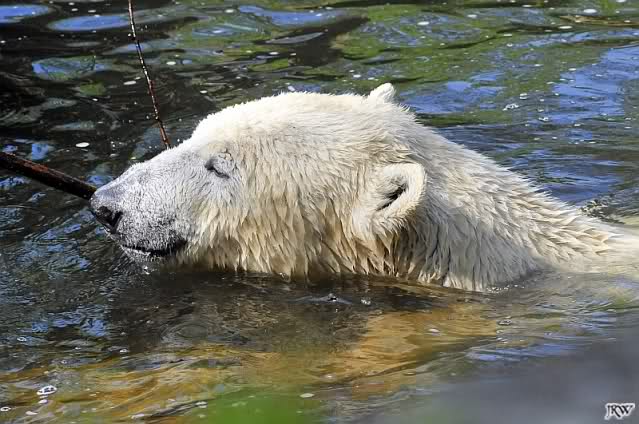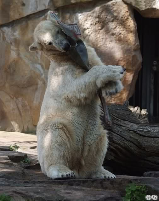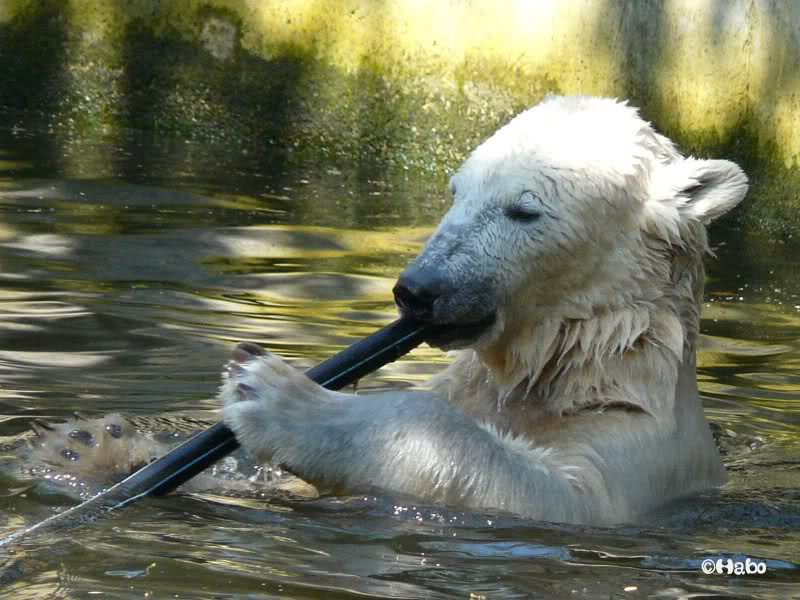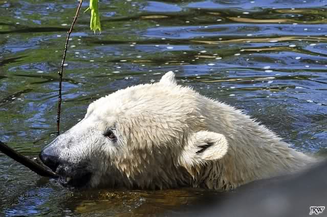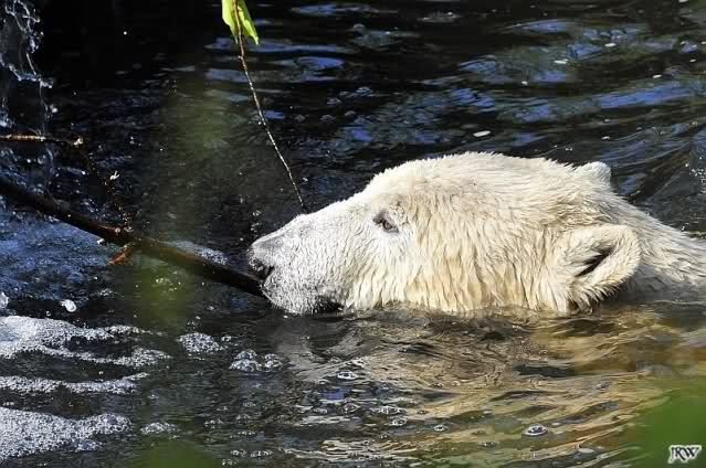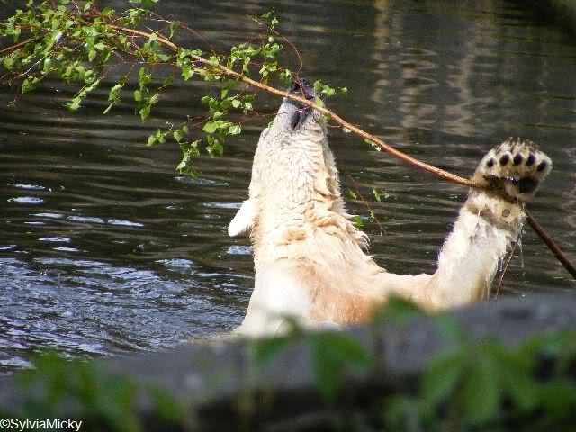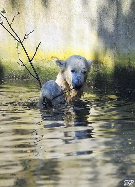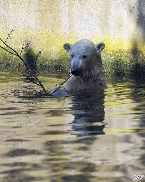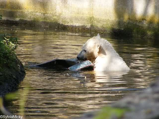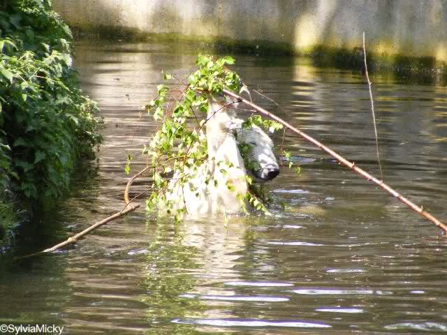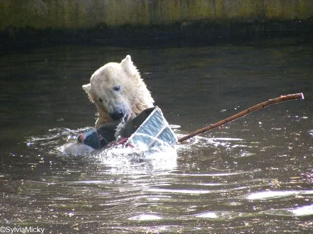 Heute Morgen war Knut erst noch ein wenig müde, aber dann fing er an zu gärtnern und spielte im Wasser mit dem großen Zweig von gestern und natürlich mit seinem geliebten Nackthuhn.