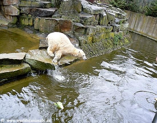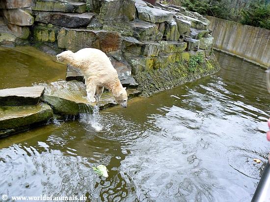 Knut was in a good mood today. Was walking up and down in his enclusure, waiting for his food. Markus Roebke came with a lot of food: apples, potates, salad, meat, from Uli sponsored grapes and one from Uli sponsored very big fish.