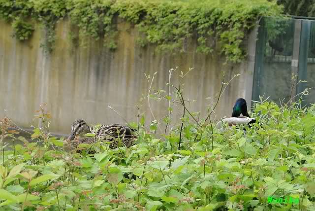 Das Entenpaar machte es sich auf der Hecke am Gehege bequem.