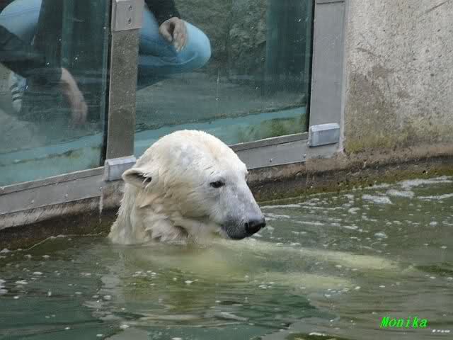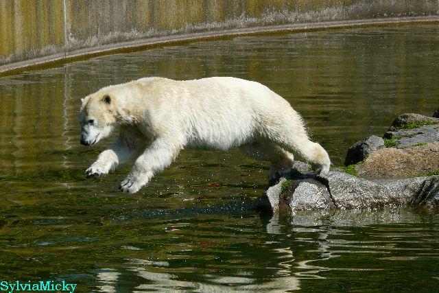 Heute Morgen war Tosca an der Scheibe, schaute die Besucher an und sprang sogar an der Scheibe hoch. Für einen Moment dachte man wieder es wäre Knut.