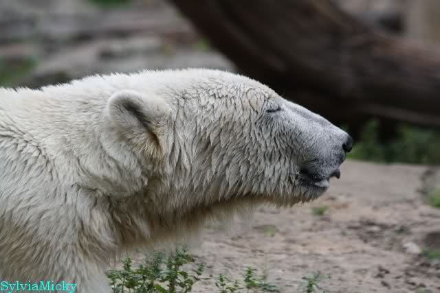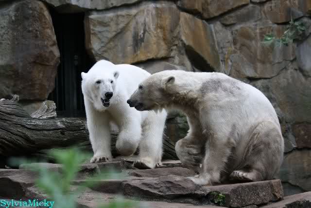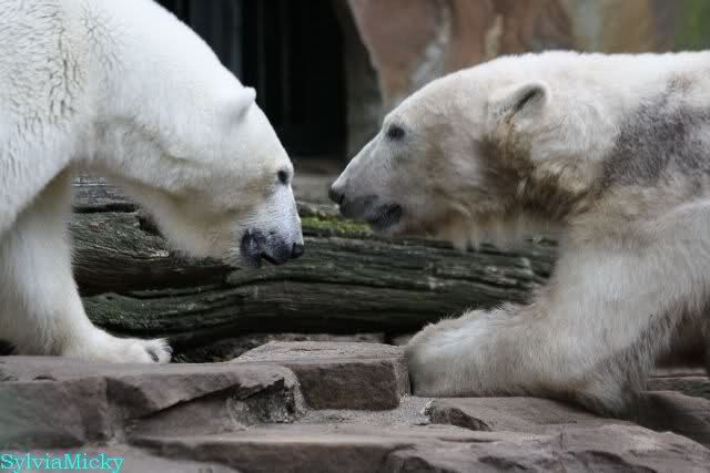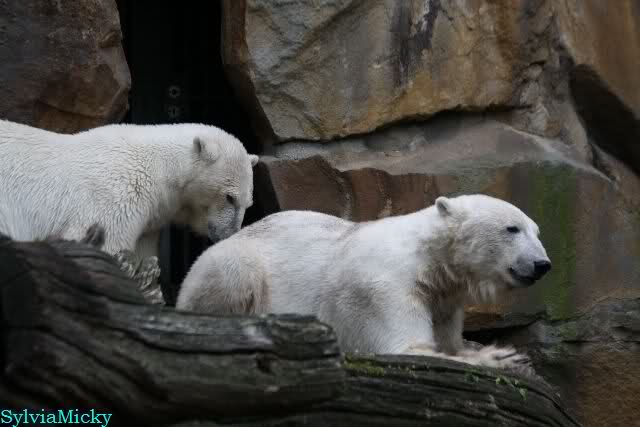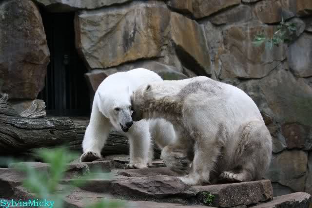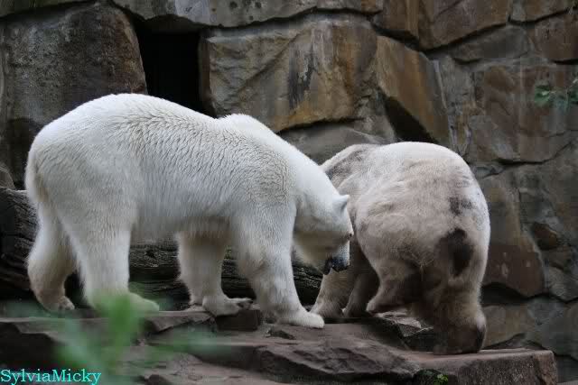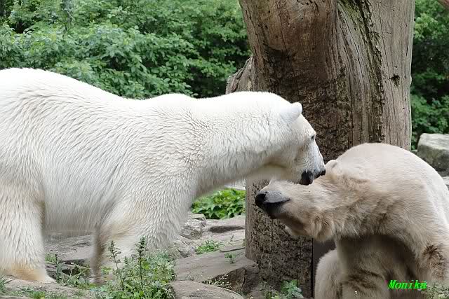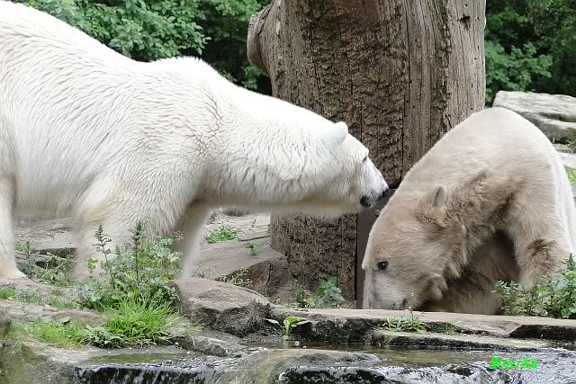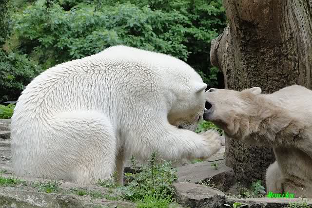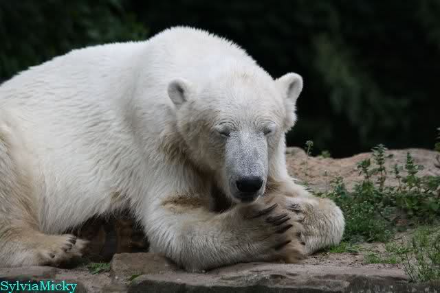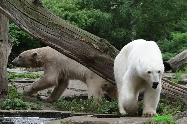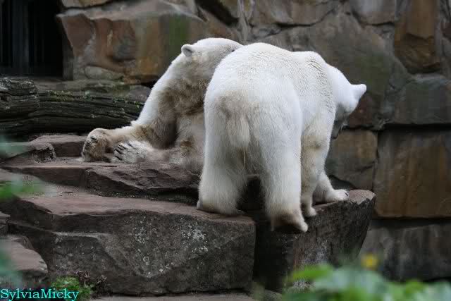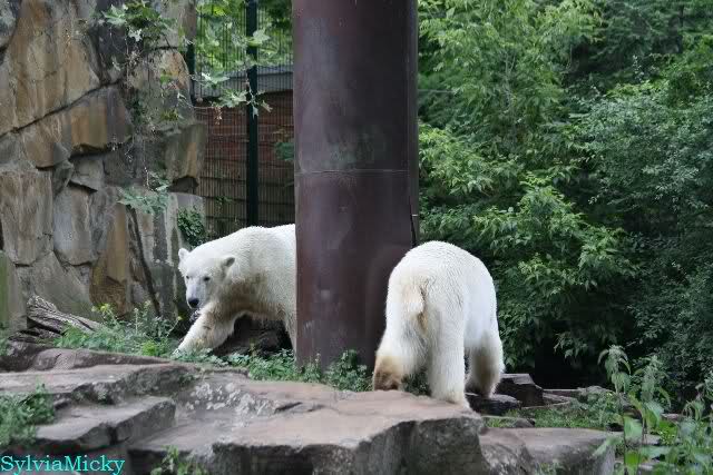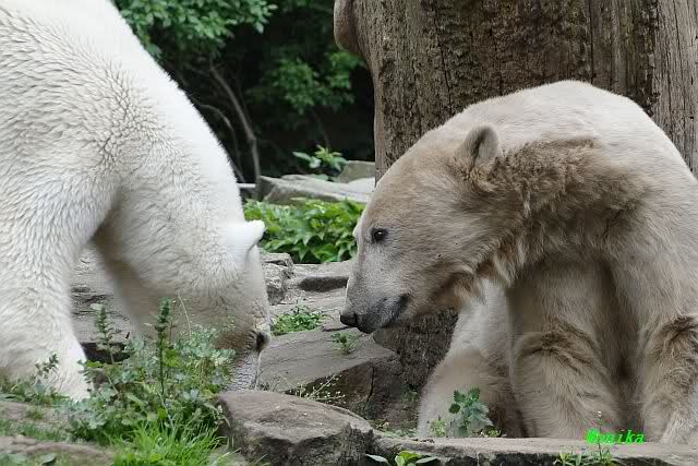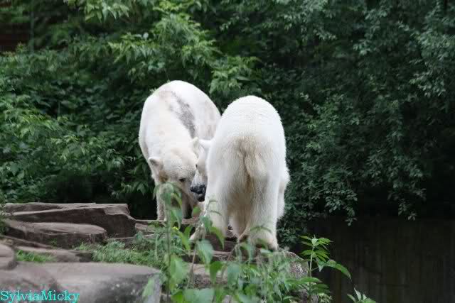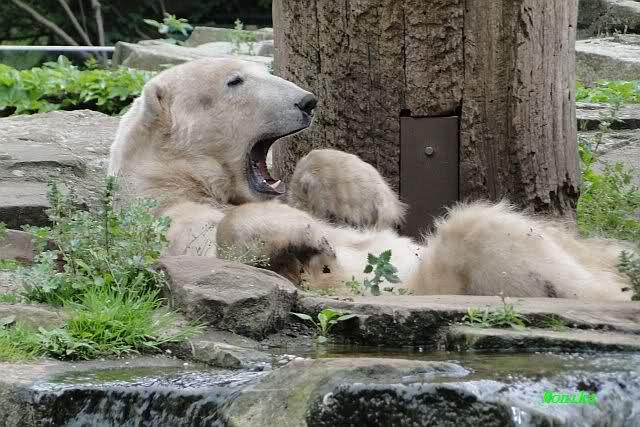 Eine Knutfreundin erzählte mir, daß die Braunbären sich gestritten haben. Gianna hatte sich sehr erschrocken und lief zu Knut hin der unter dem Baum lag und schlief. Er brummte sie aber weg. Gianna lief den ganzen Vormittag und setzte sich erst gegen eins hin.