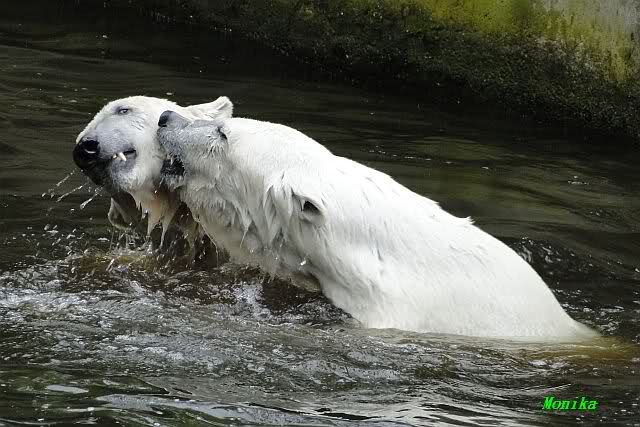 Nach der Fütterung kam Gianna in einem rasanten Tempo angerannt, dass Knut sofort ins Wasser flüchtete.